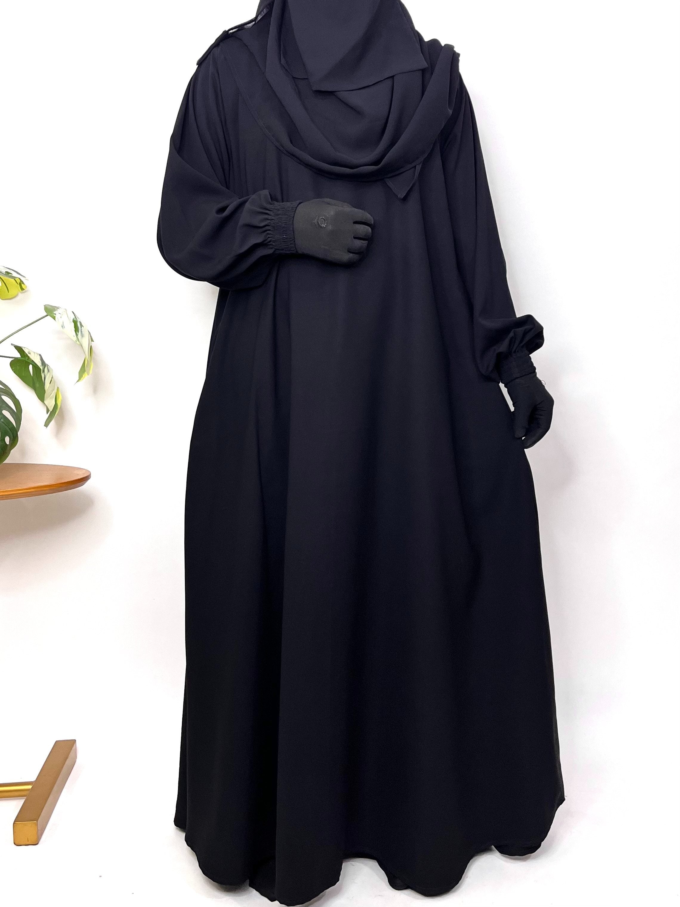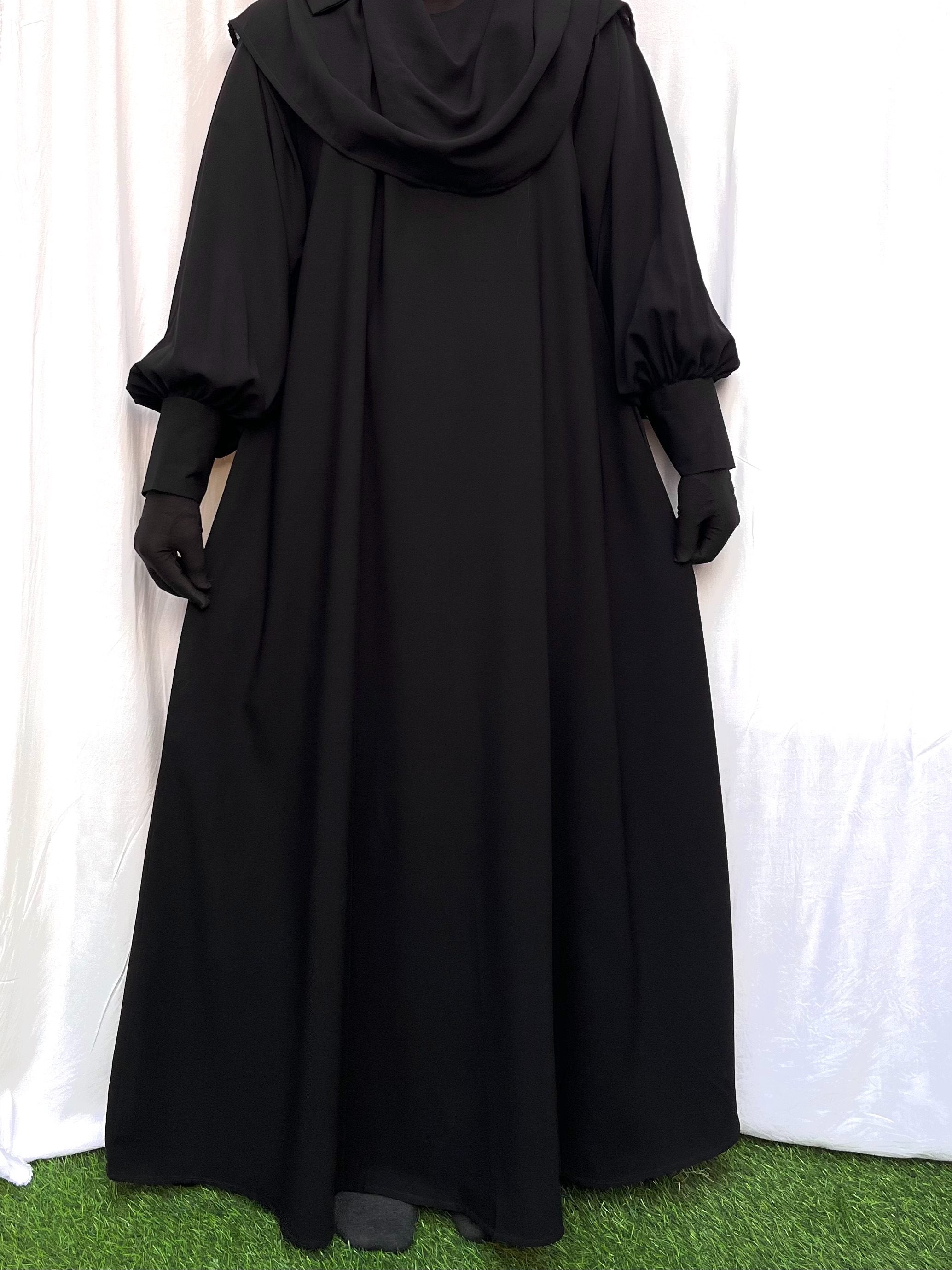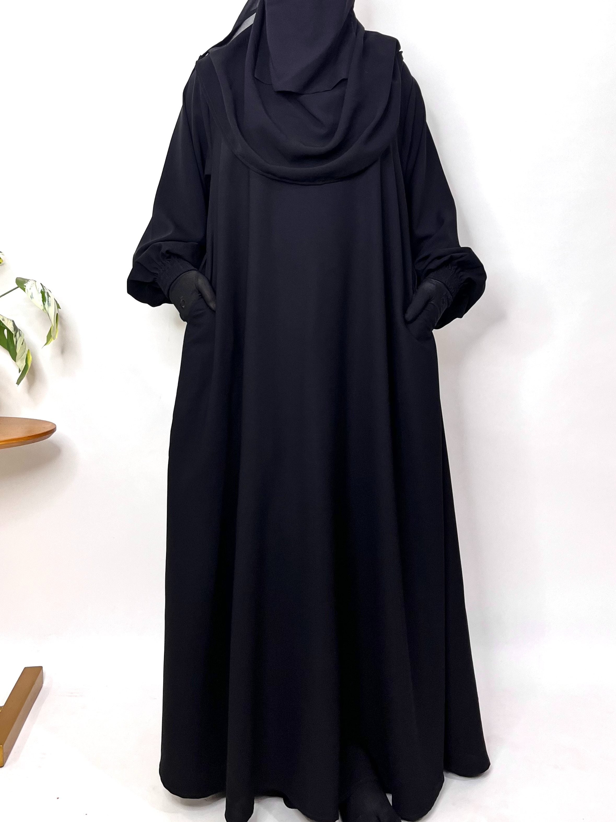 Embrace comfort and grace with this black basic abaya designed to flatter your silhouette. It features elastic sleeves for ease of movement and convenient pockets on both sides. Complete your look with the included black georgette dupatta, finished with matching borders for a refined, coordinated appearance.