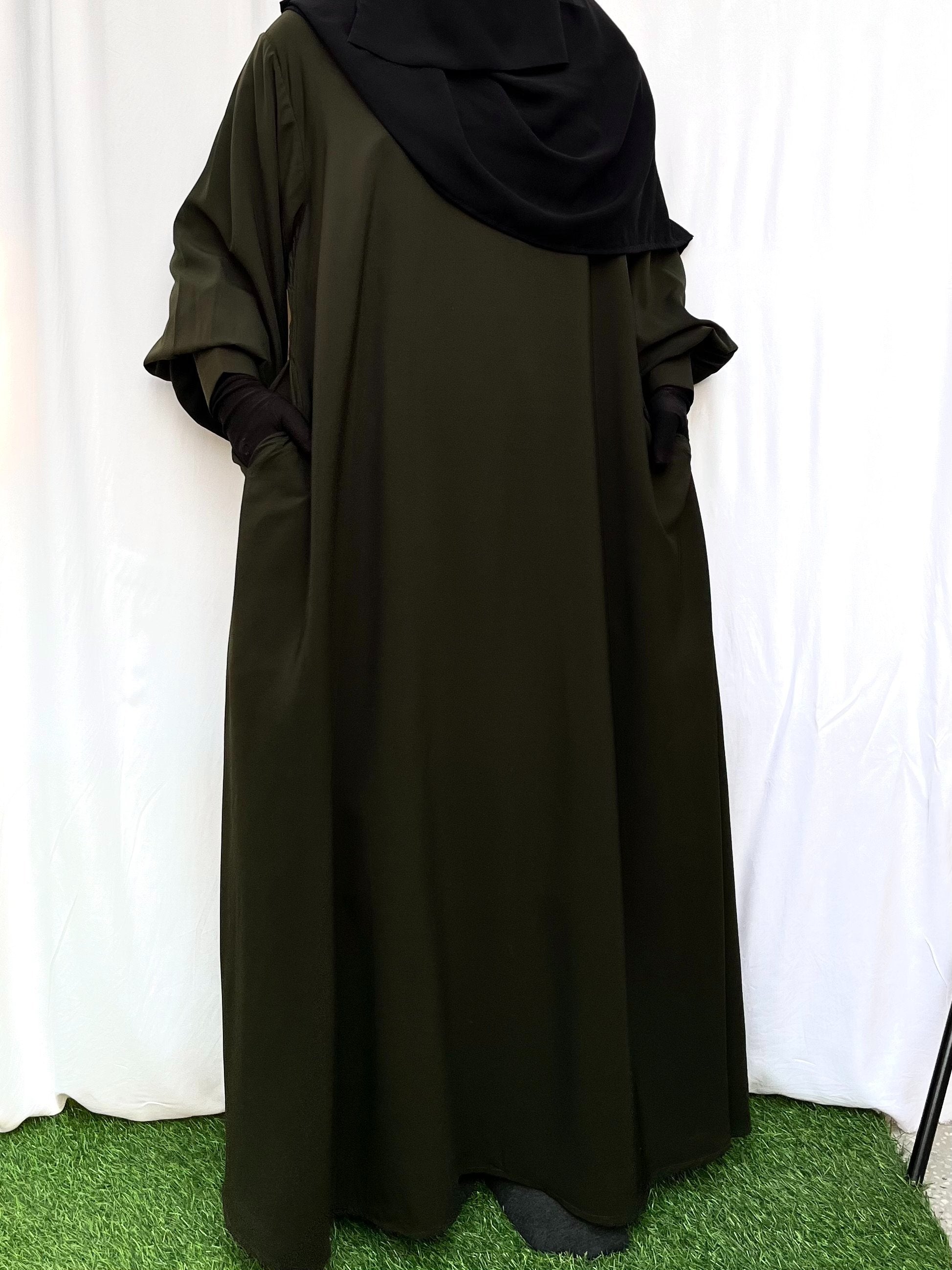 Embrace comfort and grace with this olive basic abaya designed to flatter your silhouette. It features cuff sleeves for ease of movement and convenient pockets on both sides. Complete your look with the included black georgette dupatta, finished with matching borders for a refined, coordinated appearance.