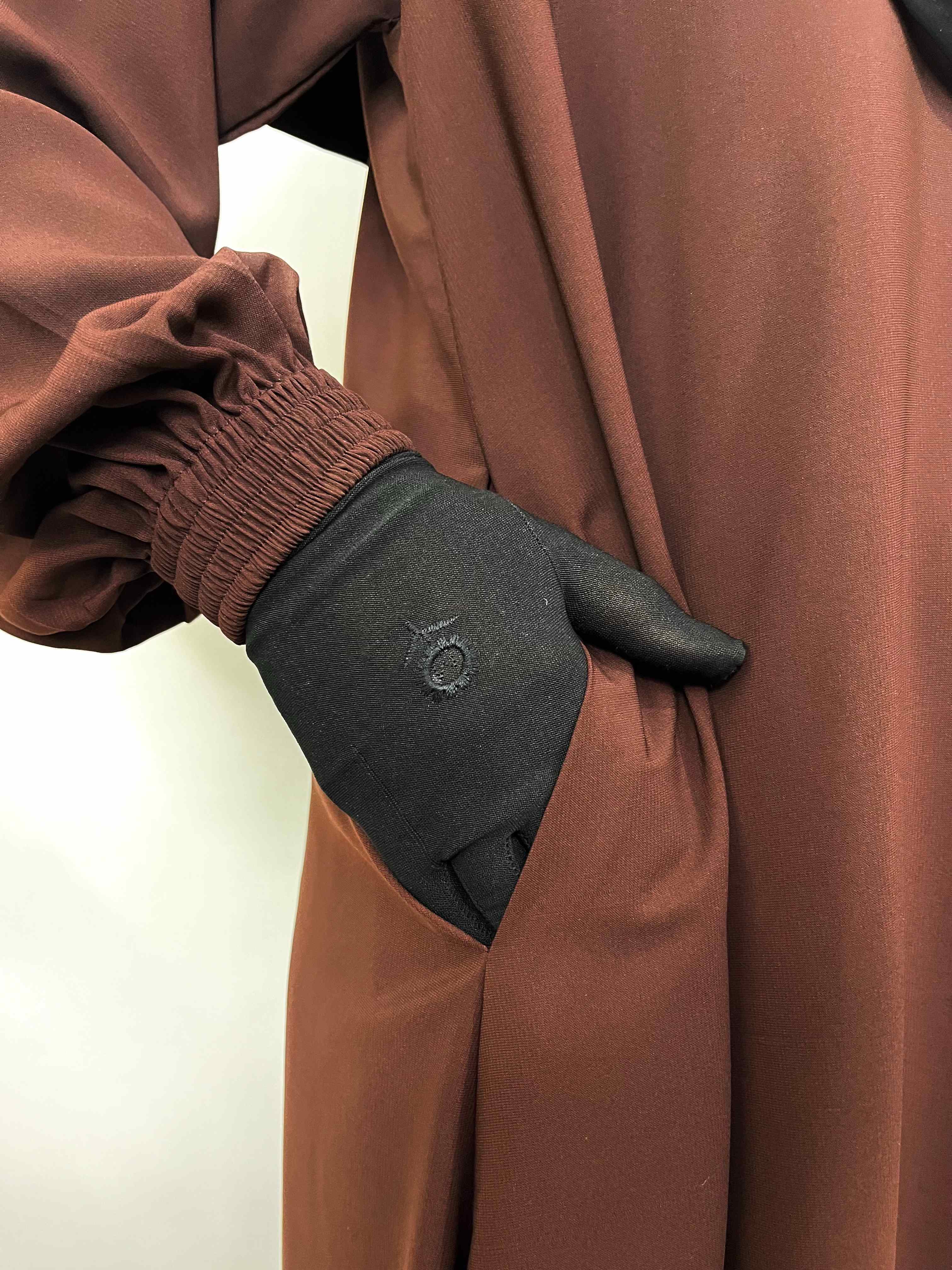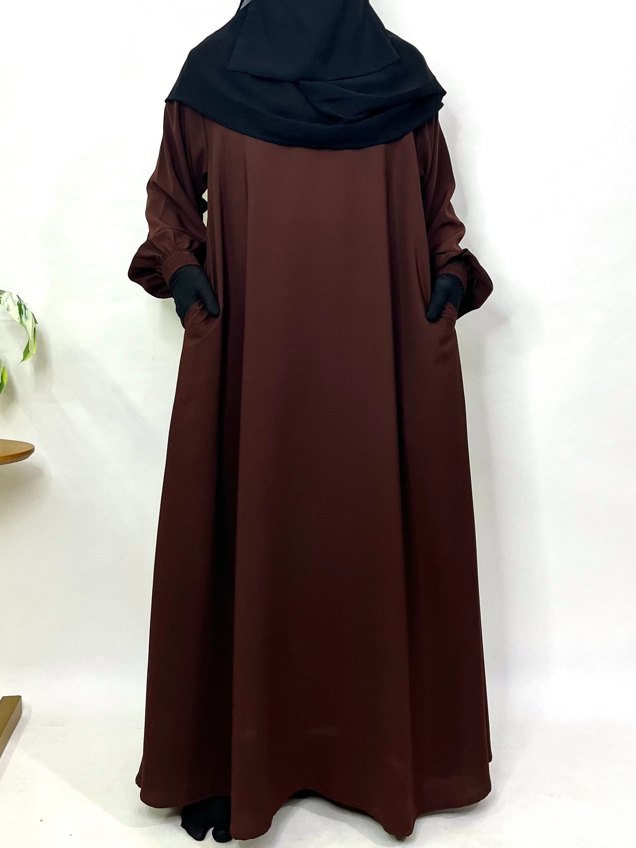 Embrace comfort and grace with this Brown basic abaya designed to flatter your silhouette. It features elastic sleeves for ease of movement and convenient pockets on both sides. Complete your look with the included black georgette dupatta, finished with matching borders for a refined, coordinated appearance.
