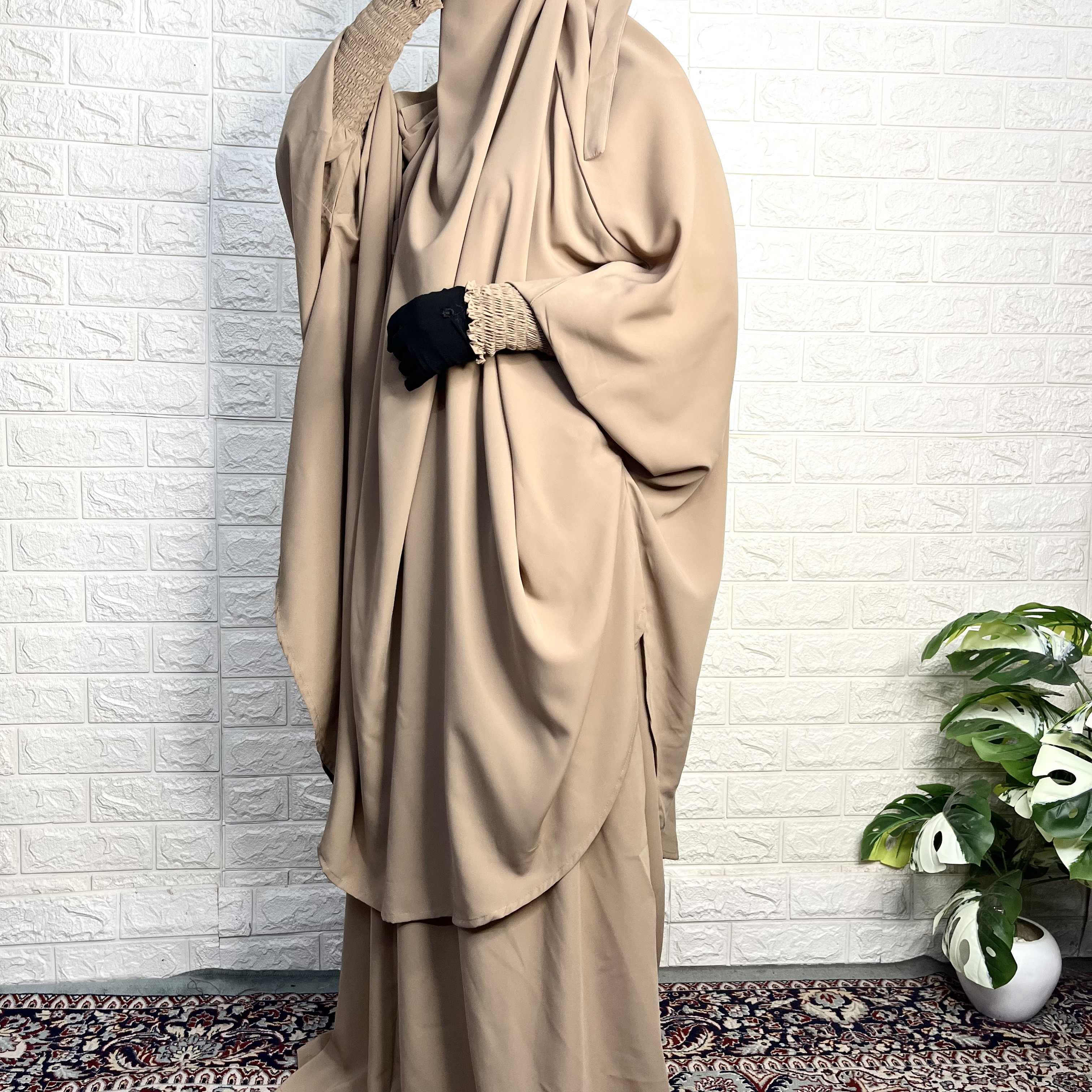 Stay stylish and modest with our Two Pc Jilbab. This two piece set includes a skirt and a jilbab, providing full coverage while keeping you comfortable with smocked sleeves. Perfect for any occasion, this jilbab allows you to stay true to your faith and fashion.