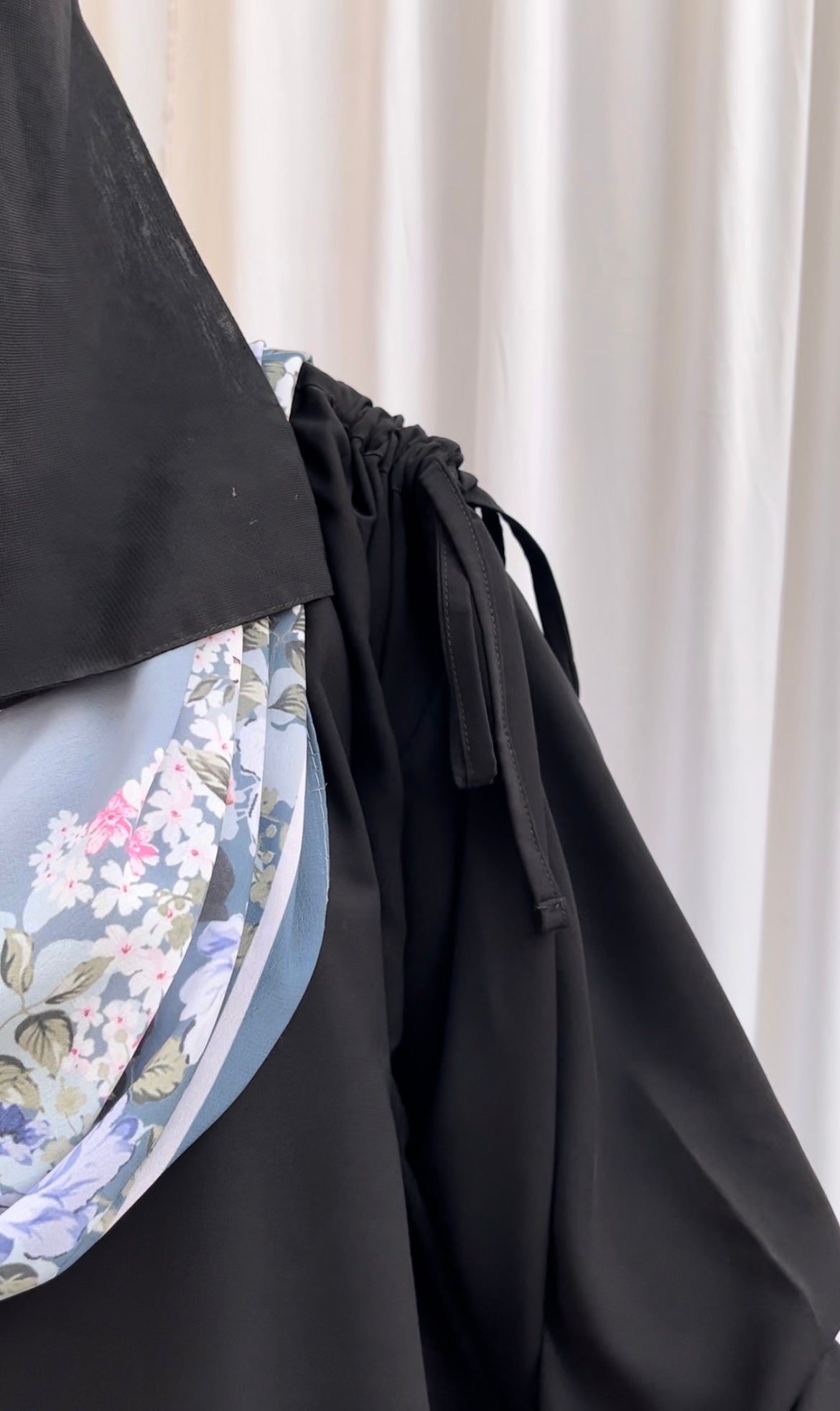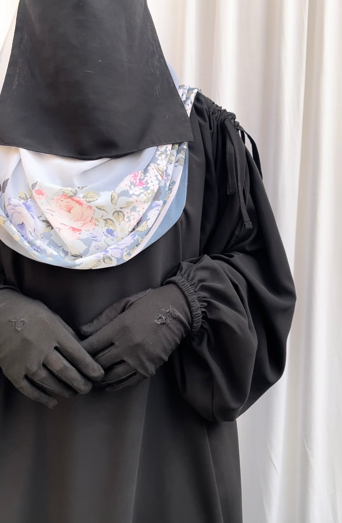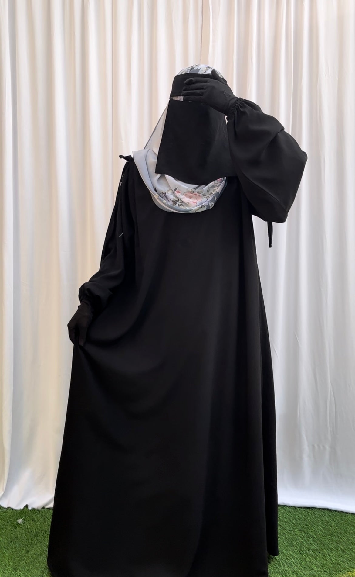 Black IQRA String Abaya offers elegant modest coverage with flary, elastic sleeves and tie strings on the shoulders for size adjustment. Say goodbye to shape reflections from any angle. Expertly designed for a perfect fit and ultimate comfort, it's the perfect addition to any modest wardrobe.
