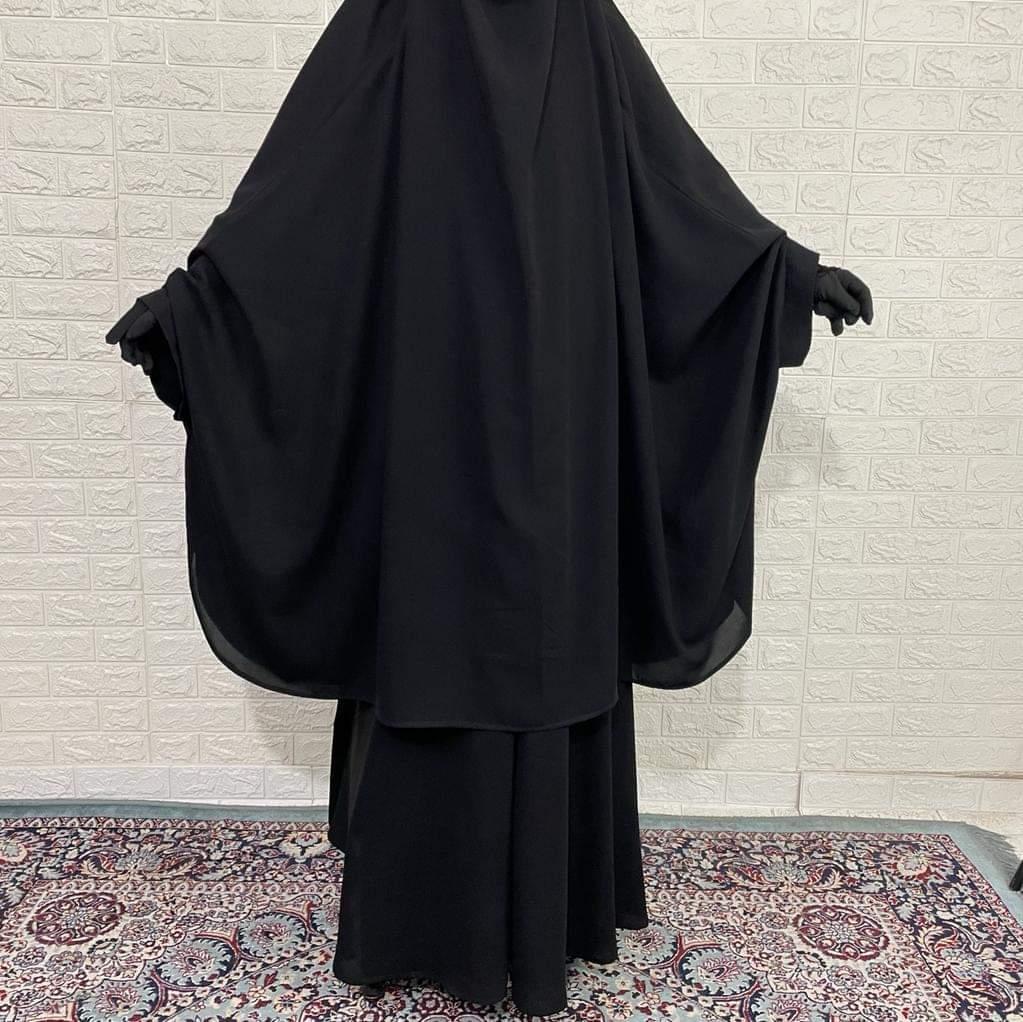 Enhance your elegant look with our Black Two Pc Abaya Set, featuring a smocked sleeves and a plain, A-line design. This set includes a half-length jilbab for a touch of sophistication and exclusivity.