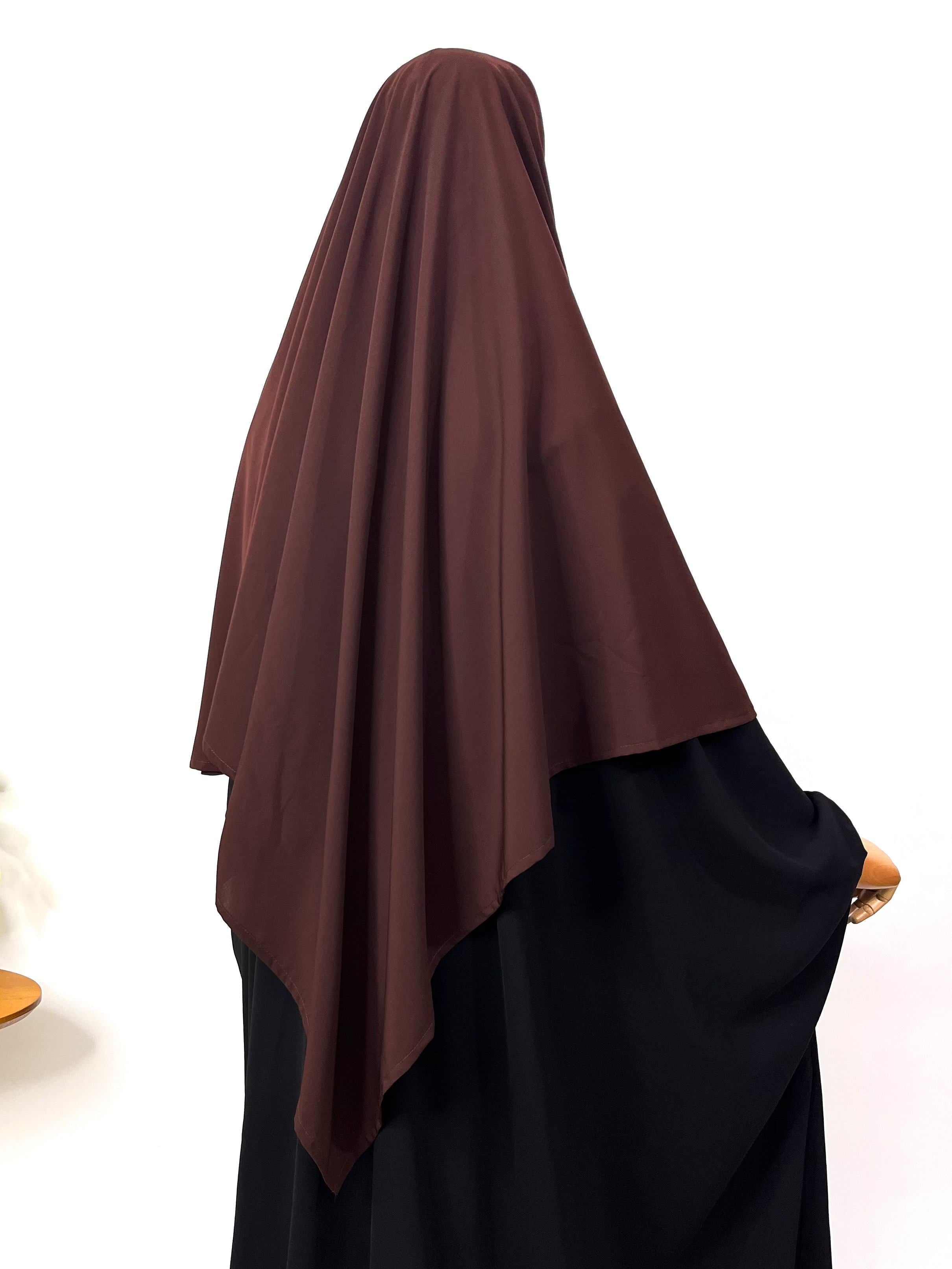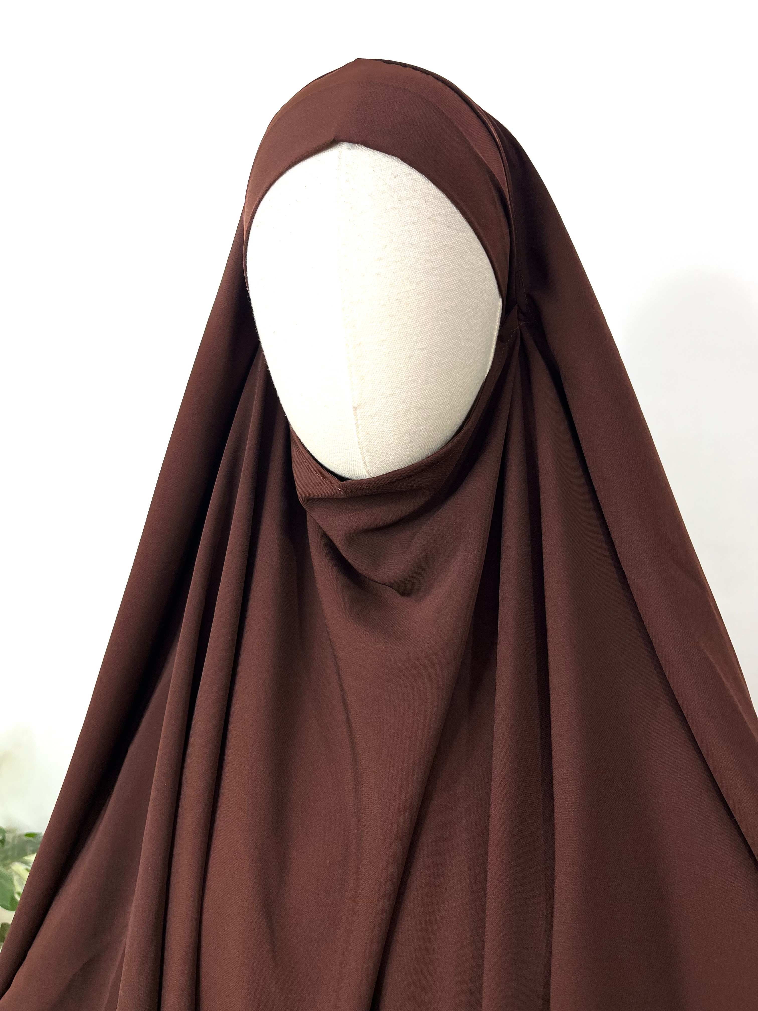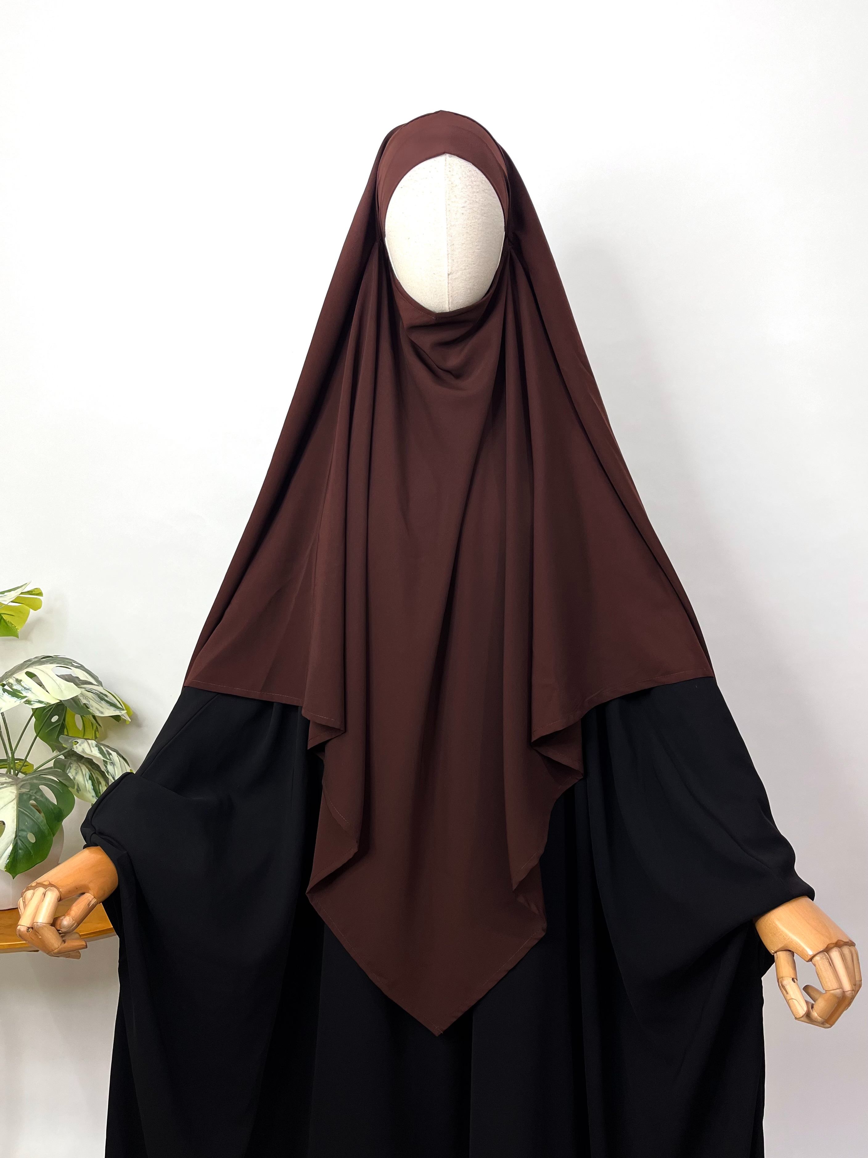 Stay cool and comfortable with our Brown French Khimar. Perfect for everyday wear, this breathable v-shade khimar features an attached niqab for added convenience. Its lightweight design makes it easy to carry, making it an essential addition to your wardrobe.