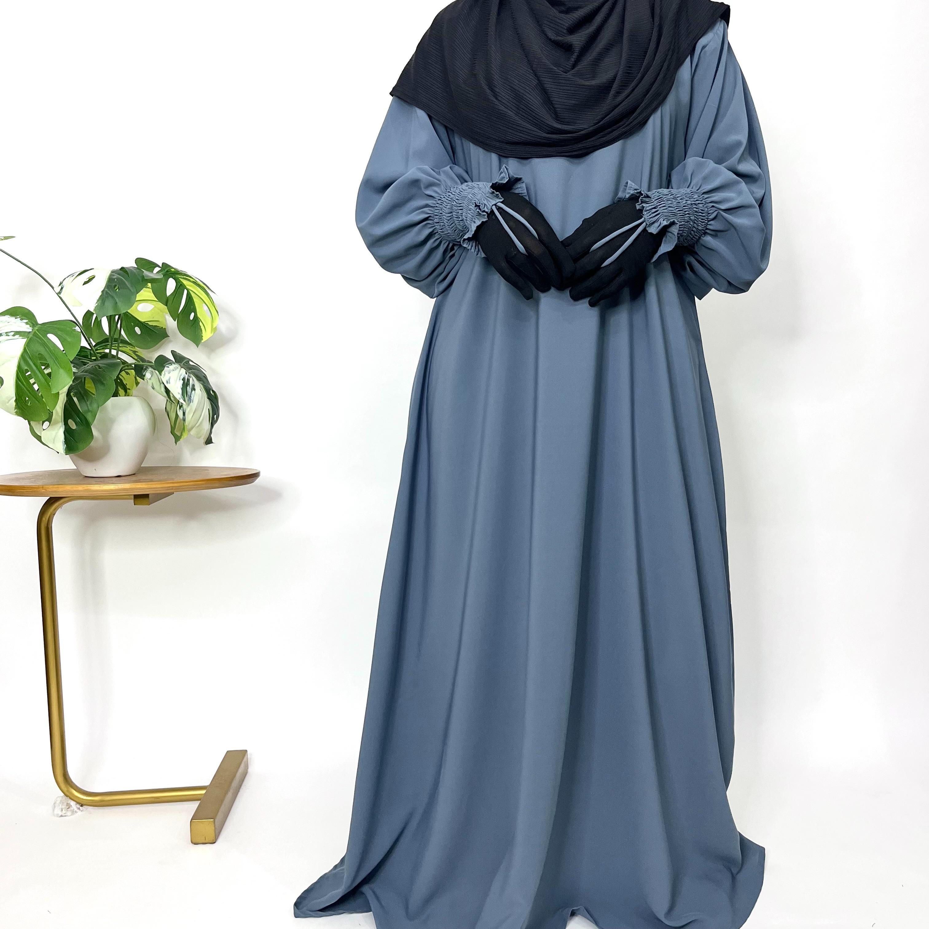 This Grey Basic Abaya features smocked sleeves that bring a graceful and feminine detail. Its A-line shape offers a gentle, flowing fit, making it ideal for daily use or special events. Enjoy both comfort and style with this adaptable garment.