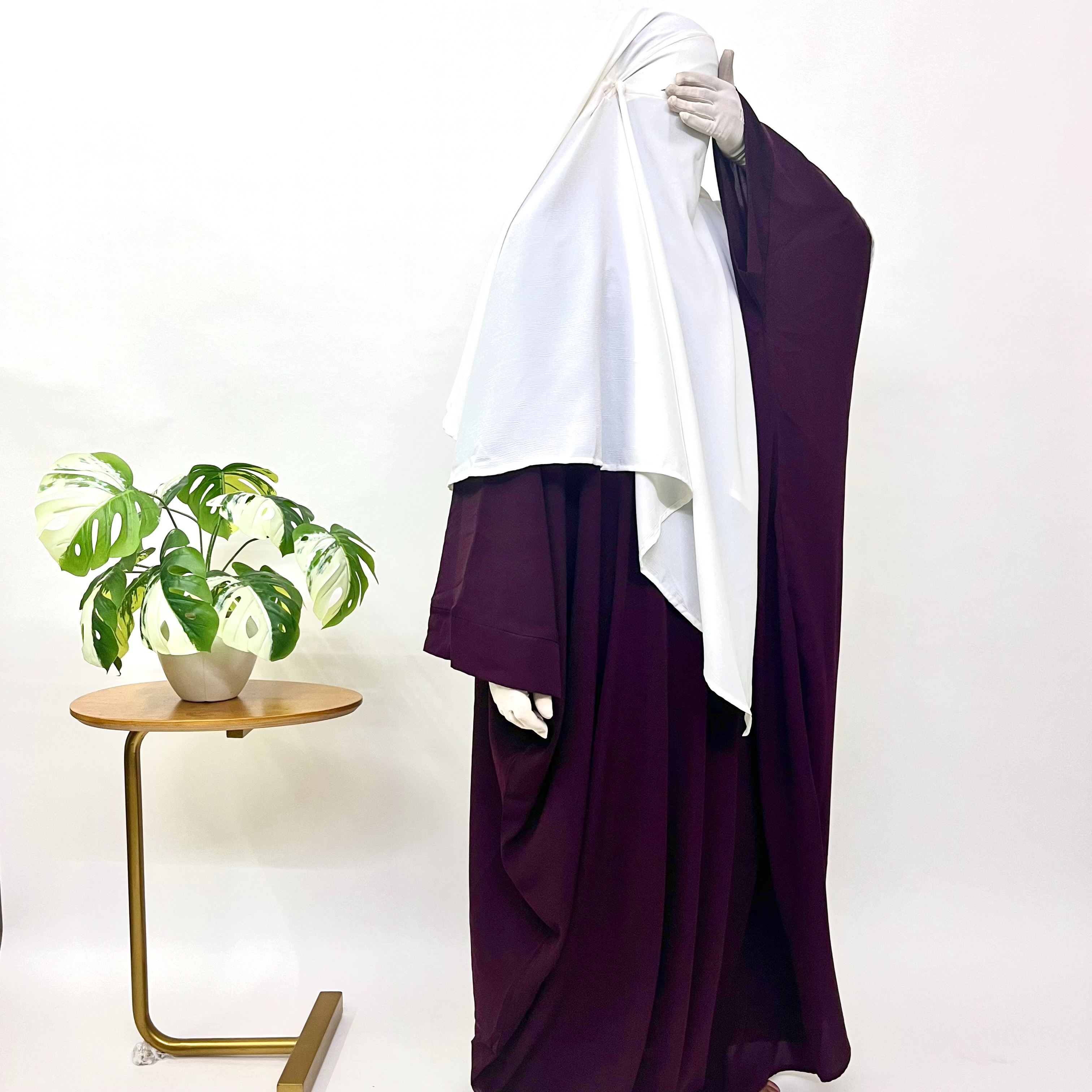 This plum Kaftan Abaya Khimar Set provides a comfortable free-size fit with broad sleeves, perfect for daily wear. Its sophisticated design brings a graceful charm to your everyday wardrobe, while the included white diamond khimar effortlessly enhances the modest and stylish ensemble. Ideal for those who value both comfort and elegance in their clothing choices.