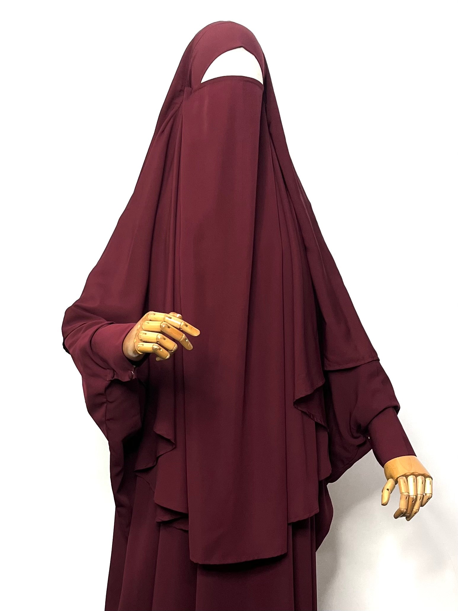 This Maroon kaftan abaya with matching round khimar set provides a comfortable free-size fit with cuff sleeves, perfect for daily wear. Its sophisticated design brings a graceful charm to your everyday wardrobe, while the included matching round khimar effortlessly enhances the modest and stylish ensemble. Ideal for those who value both comfort and elegance in their clothing choices.