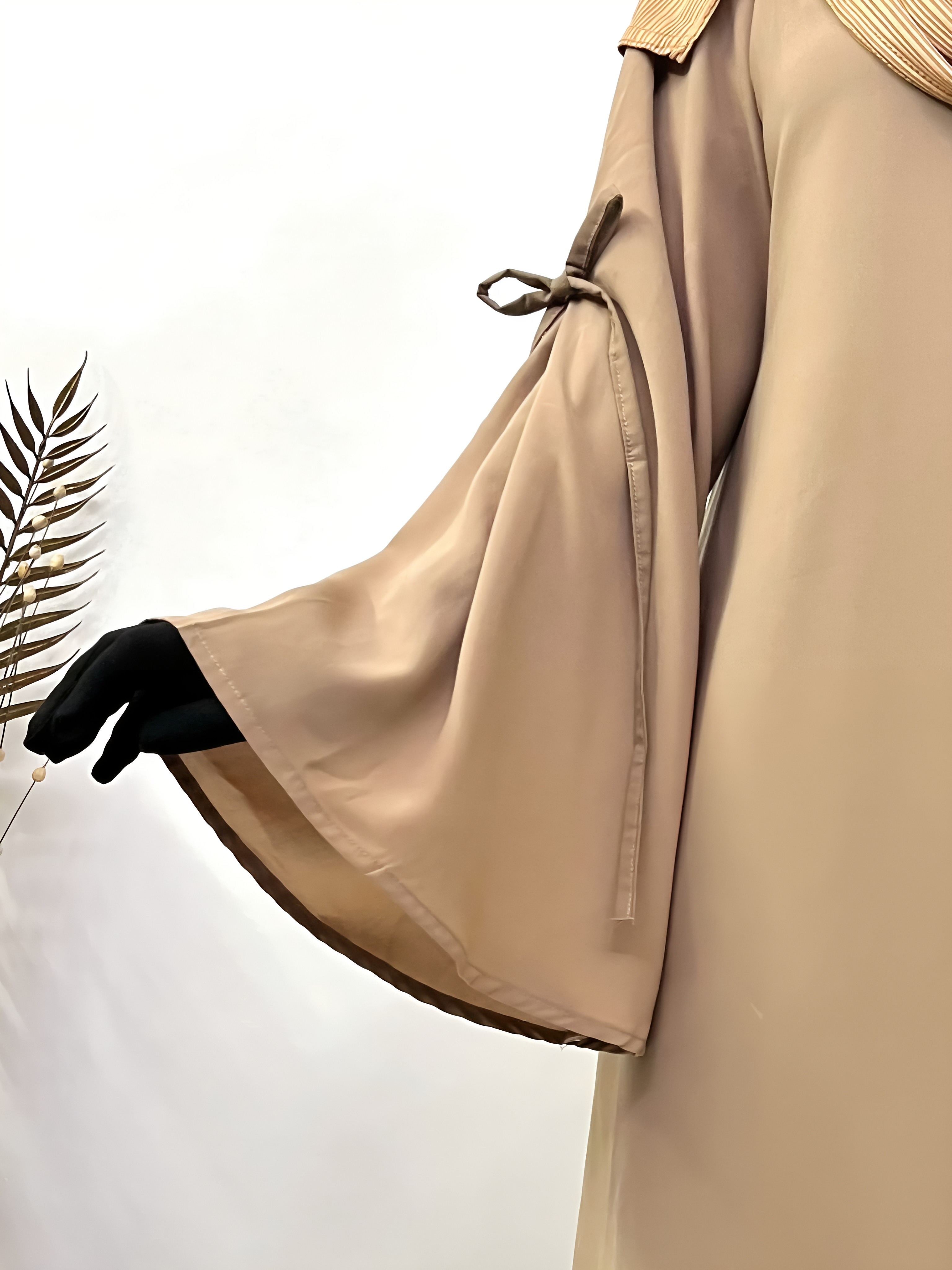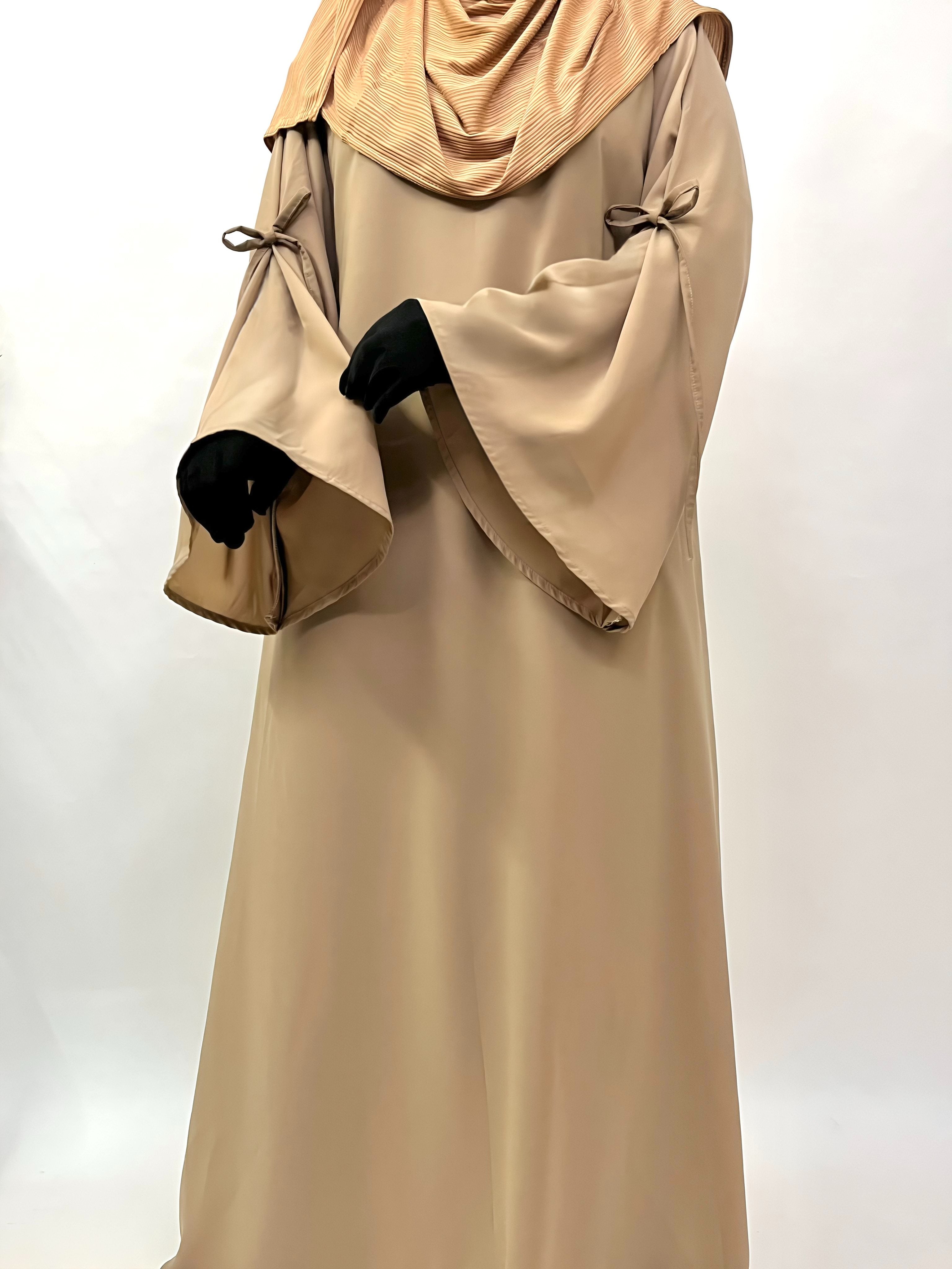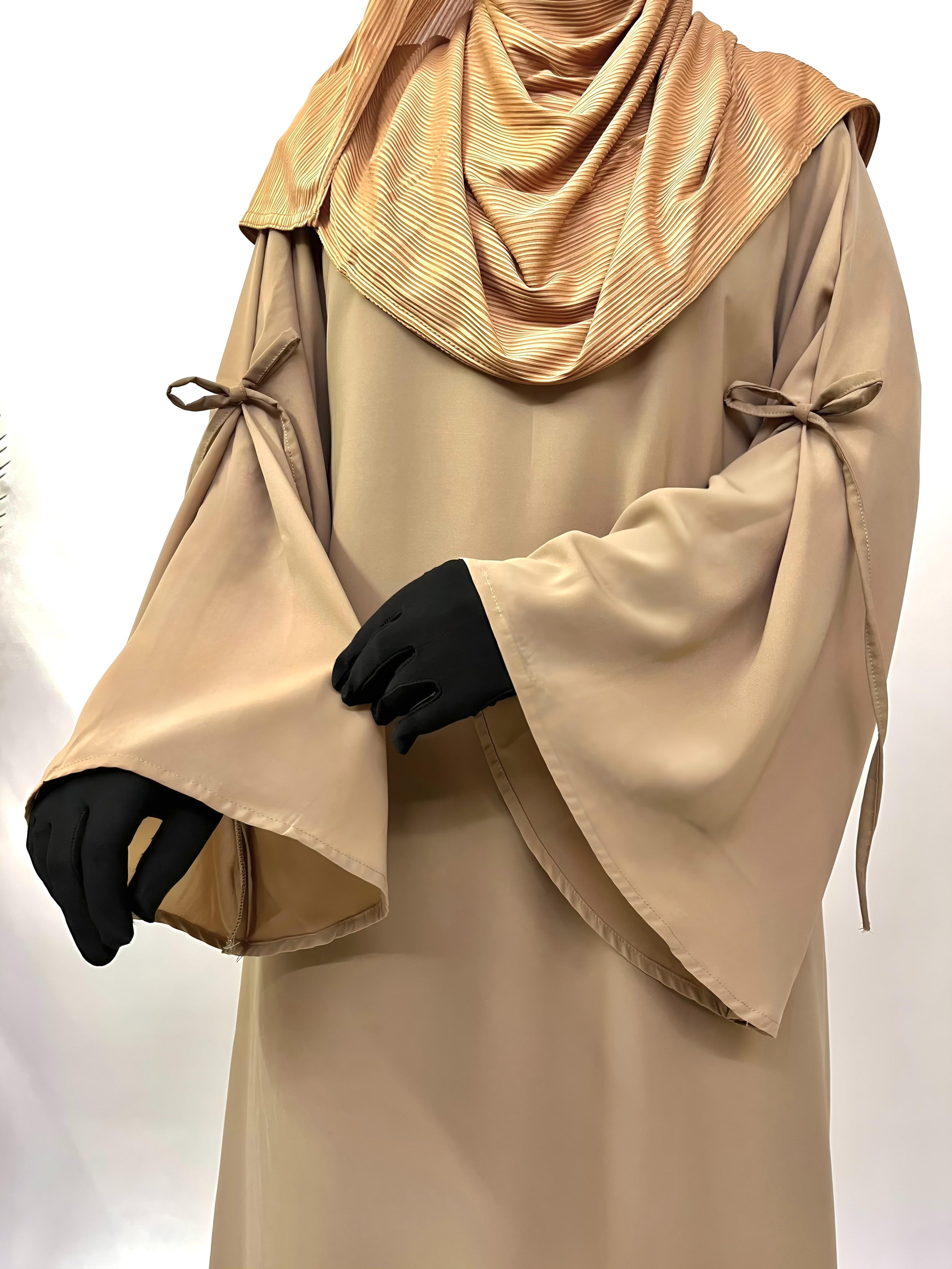 The Laiba Basic Abaya celebrates modest elegance with its distinctive bell sleeves finished with charming bows for ease of movement and convenient pockets on both sides. Designed to flatter and comfort, the A-line cut moves gracefully with you while maintaining a polished appearance. Complete your look with the included black georgette dupatta, finished with matching borders for a refined, coordinated appearance.