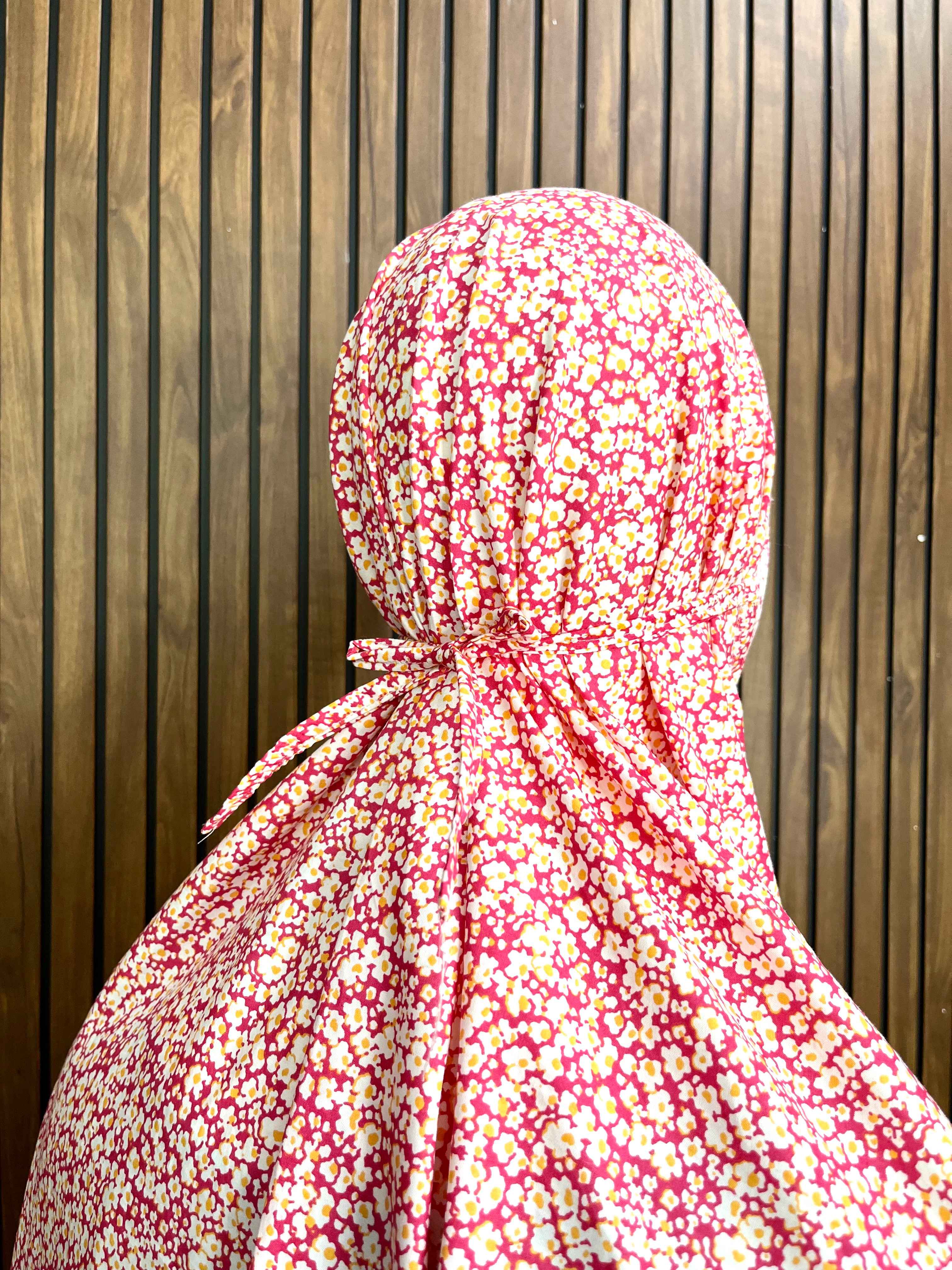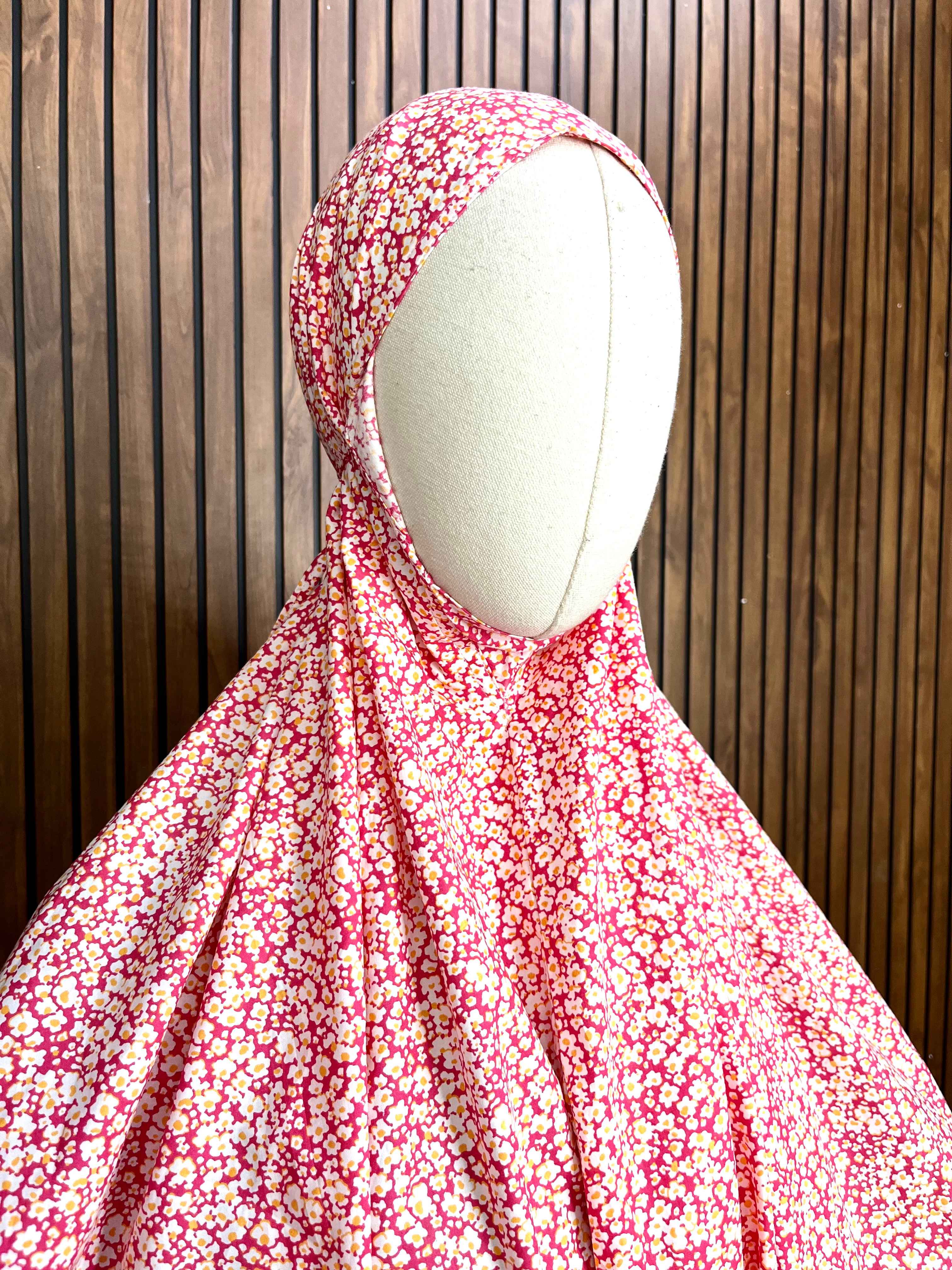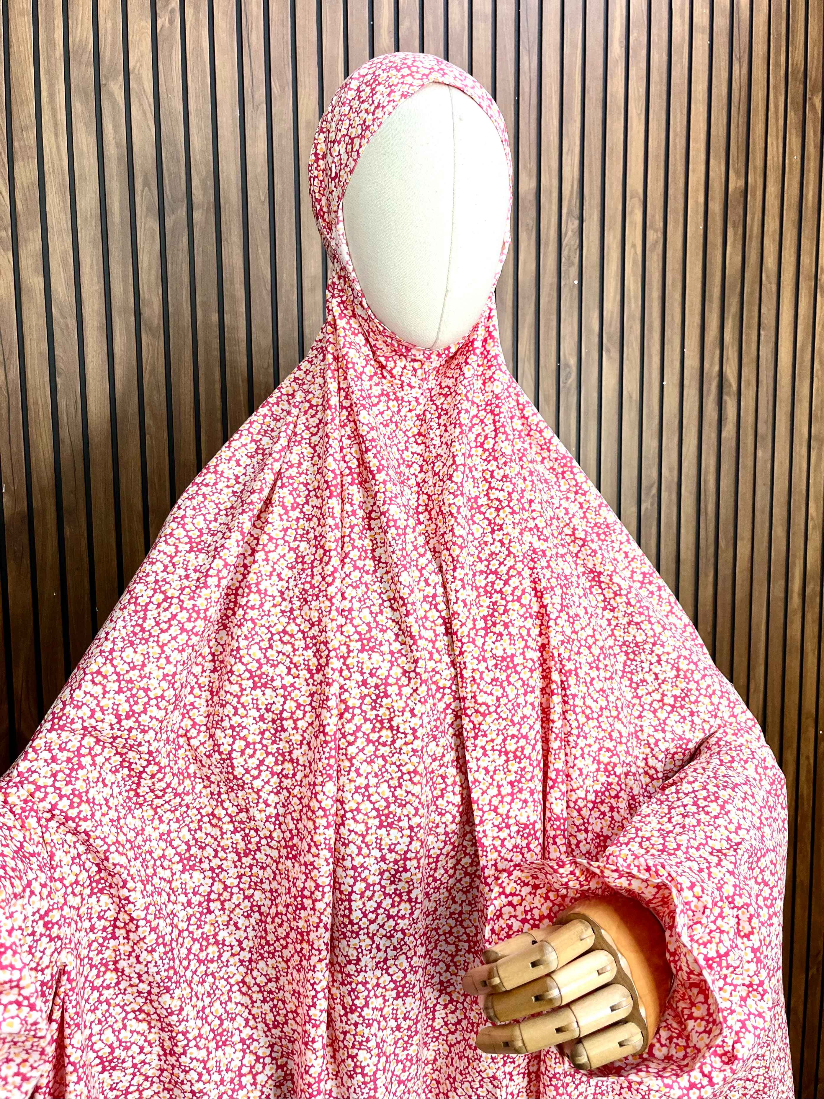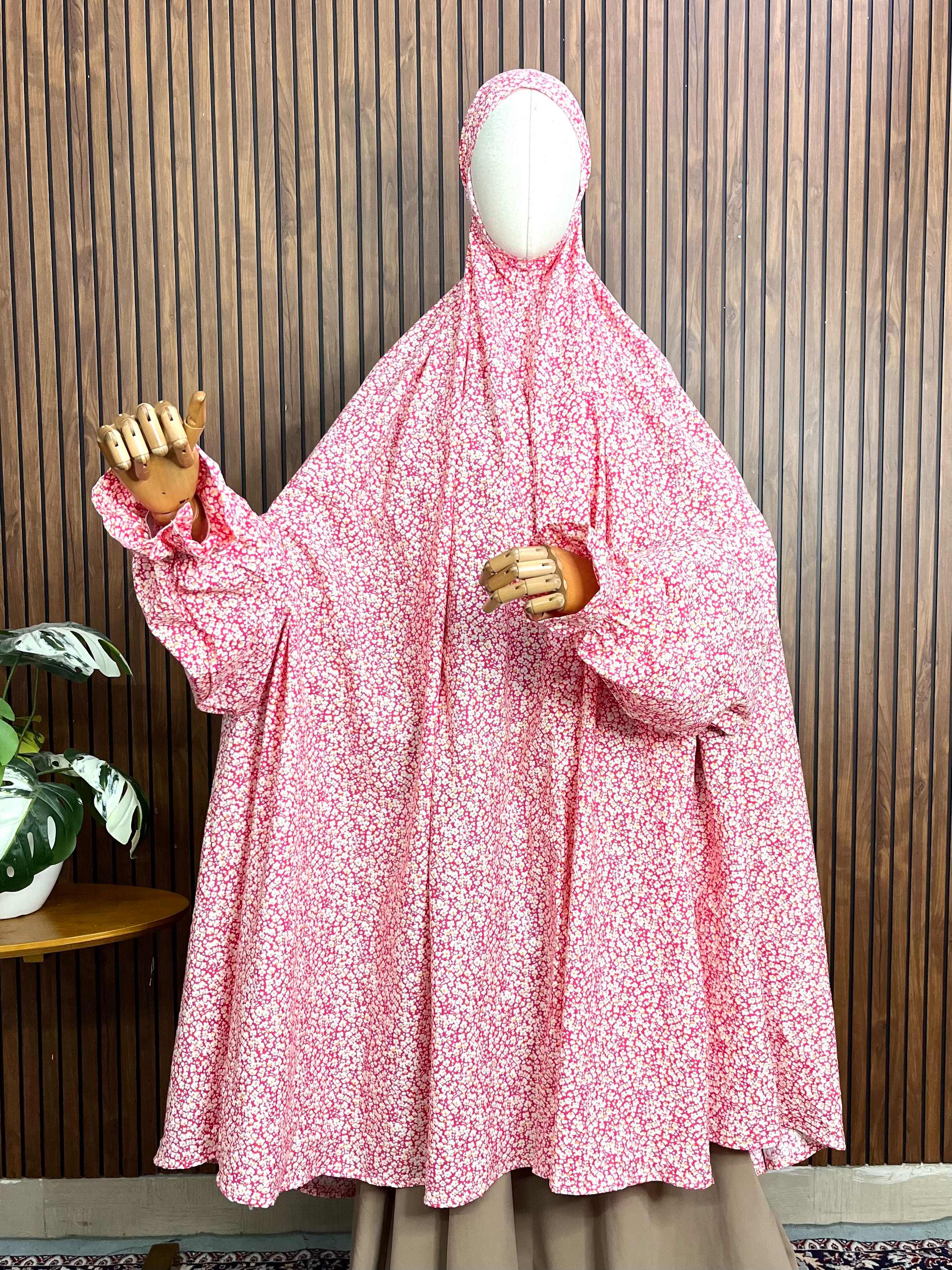 Enhance your prayer experience with our Long Salah Khimar. Its perfect length and comfortable fit make it ideal for salah, while the flower sleeves add a touch of elegance & it is knee length,. The face tie strings allow for a customizable fit. Elevate your prayer routine with ease and style.  Made from soft cotton or Rati cotton, it's a multi-functional makhana for all your prayer needs.