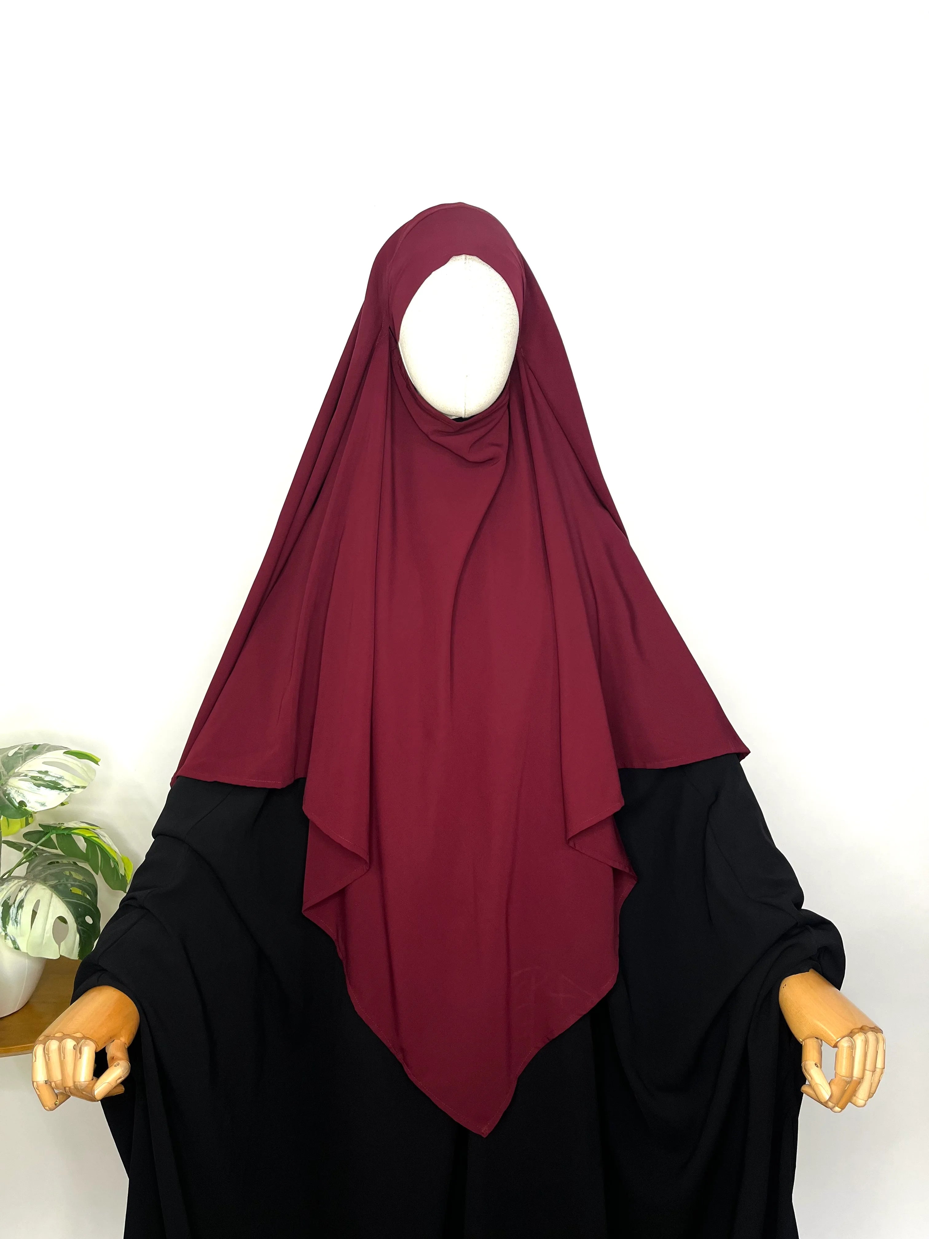 Indulge in the versatile Maroon Khimar! Our french khimar is made with breathable fabric for comfort and ease, and comes with an attached niqab for added convenience. Perfect for everyday wear, and its compact design makes it easy to carry wherever you go.