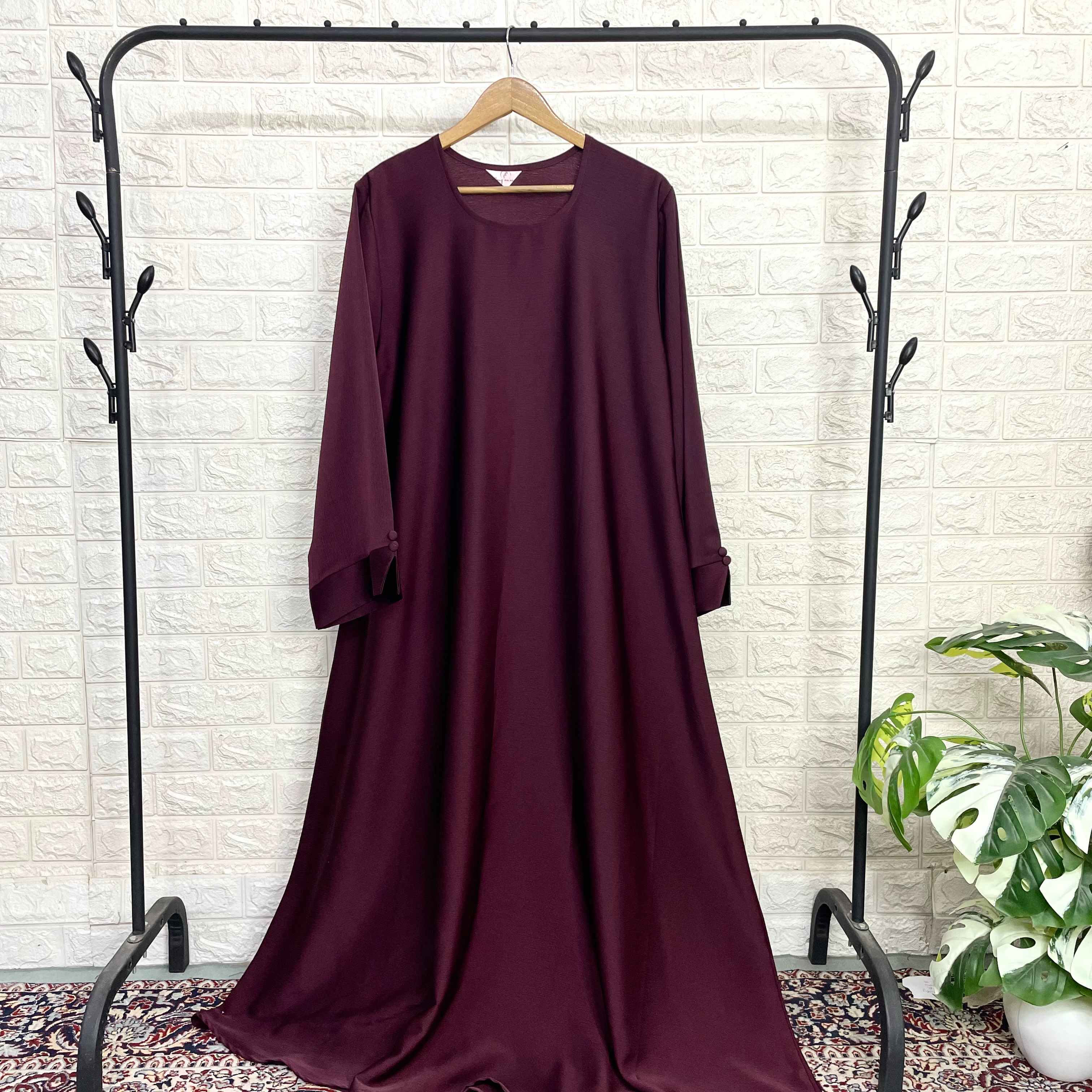 Embrace modest elegance with our TikTok Abaya featuring fashionable broad sleeves with button details. This contemporary design combines traditional modesty with trending style, perfect for creating those viral TikTok moments while maintaining a graceful silhouette. The rich maroon shade adds a touch of sophistication to your wardrobe.
