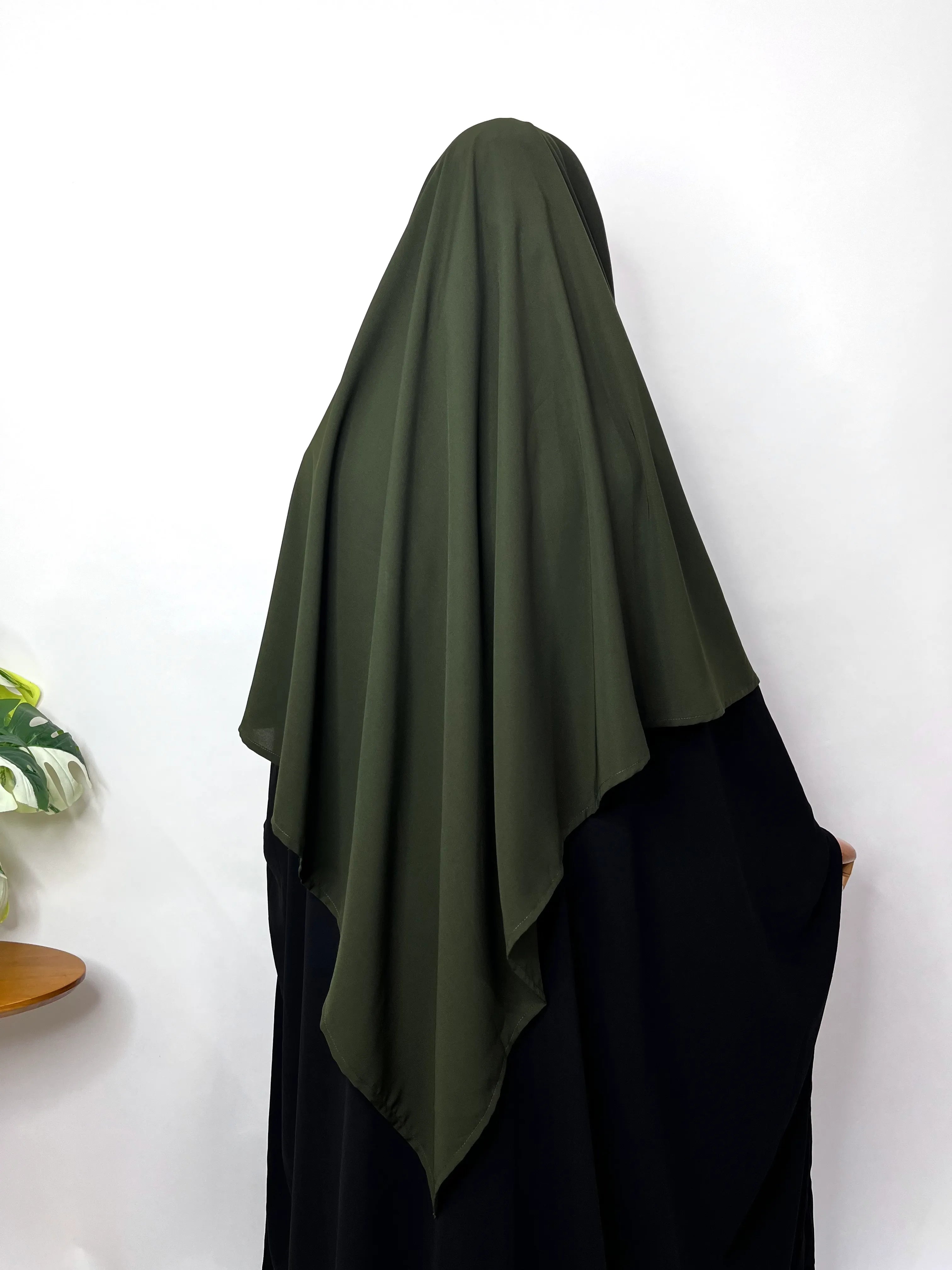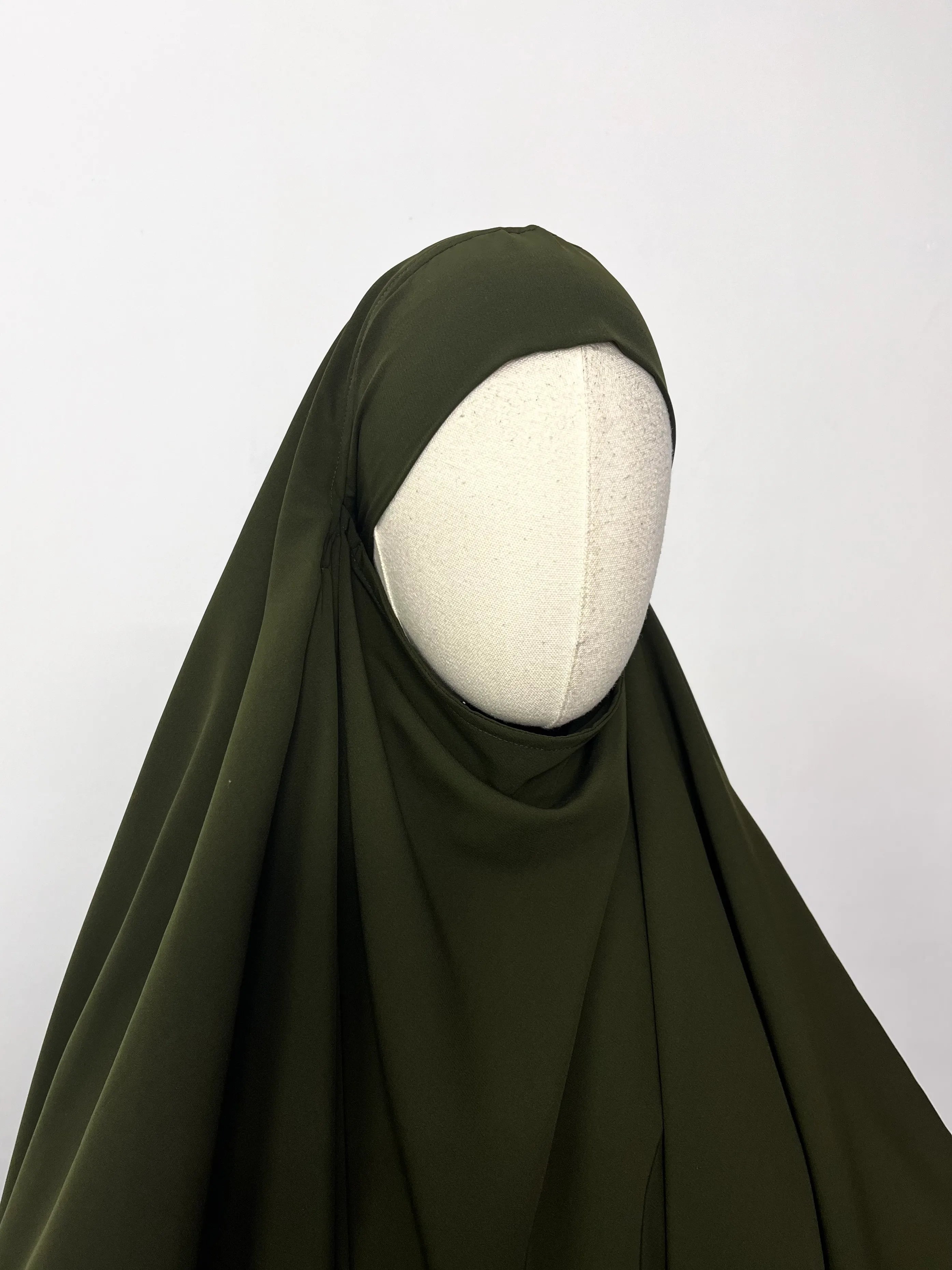 Indulge in the versatile Olive Khimar! Our  french khimar is made with breathable fabric for comfort and ease, and comes with an attached niqab for added convenience. Perfect for everyday wear, and its compact design makes it easy to carry wherever you go.