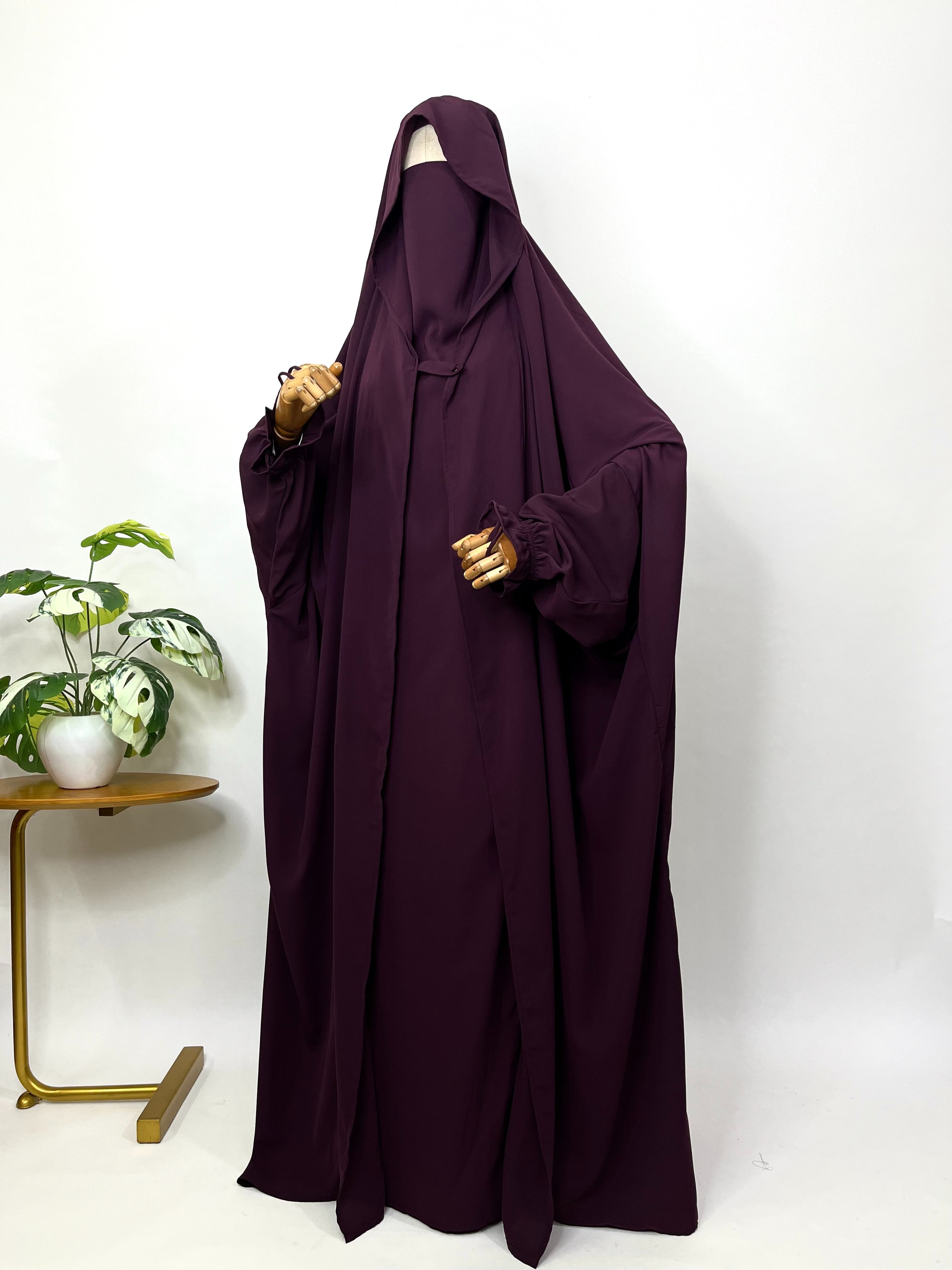 Introducing Plum Saudi Jilbab with flap - a modest and elegant choice for your wardrobe. This one pc jilbab features a convenient flap design and delicate flower sleeves with loops for added style and ease. Made from high-quality materials, it offers comfort and sophistication in one. Elevate your modest fashion with Saudi Jilbab.