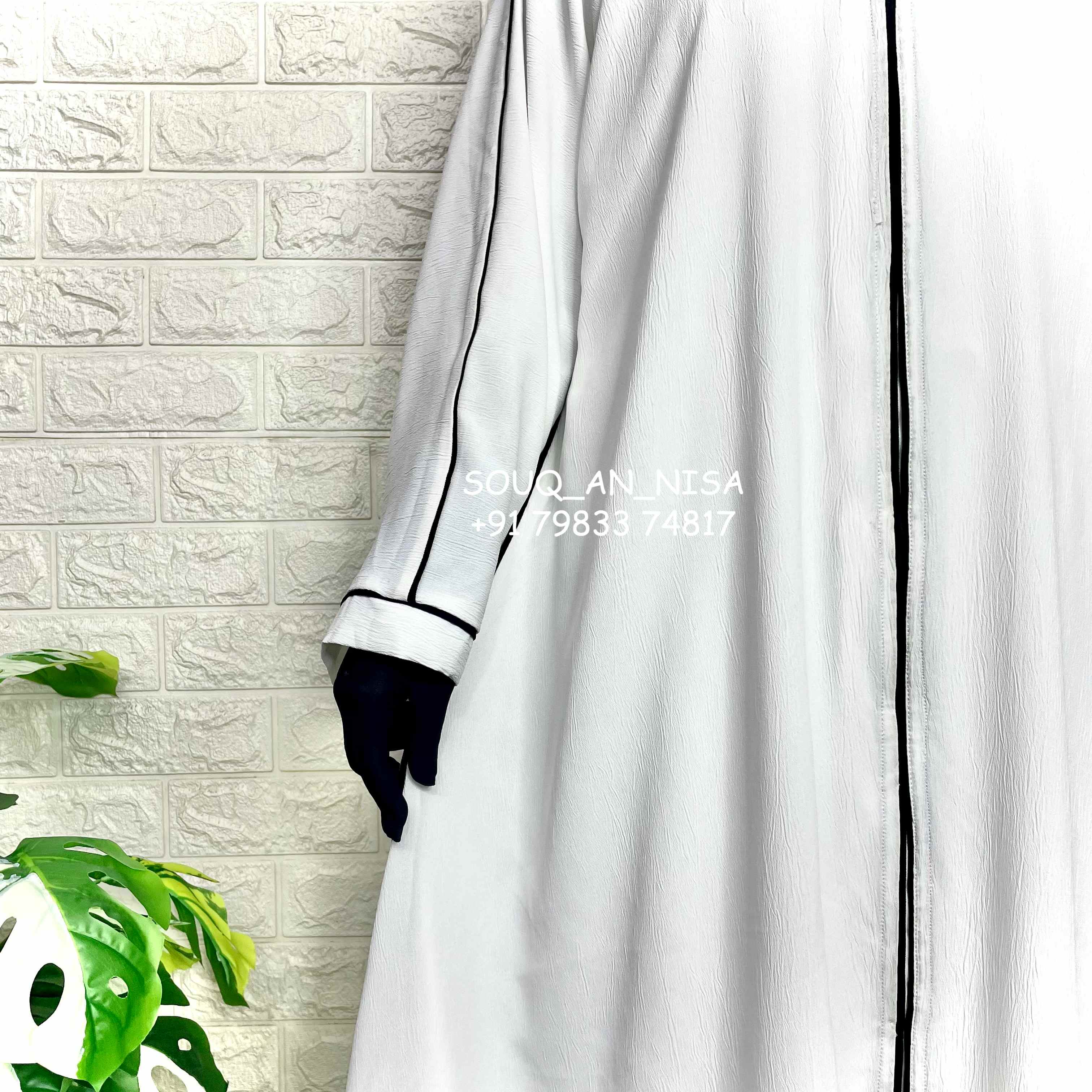 Elevate your style with our white cey crush abaya with black piping front open! Made with a luxurious crushed fabric, this abaya features a front open and a subtle slit at the bottom for effortless movement. The contrasting black piping adds a touch of sophistication to this timeless design. Embrace elegance with every wear.