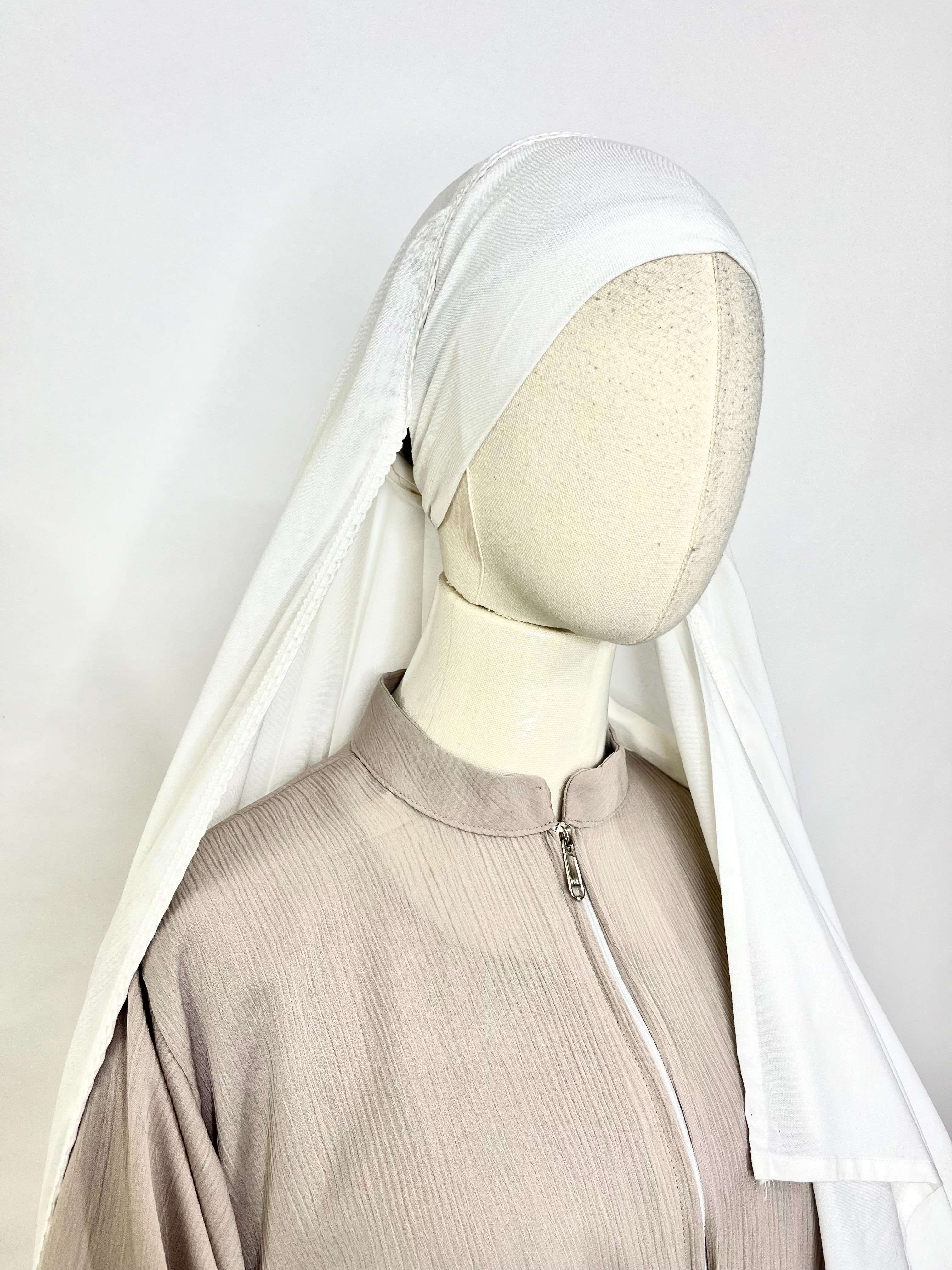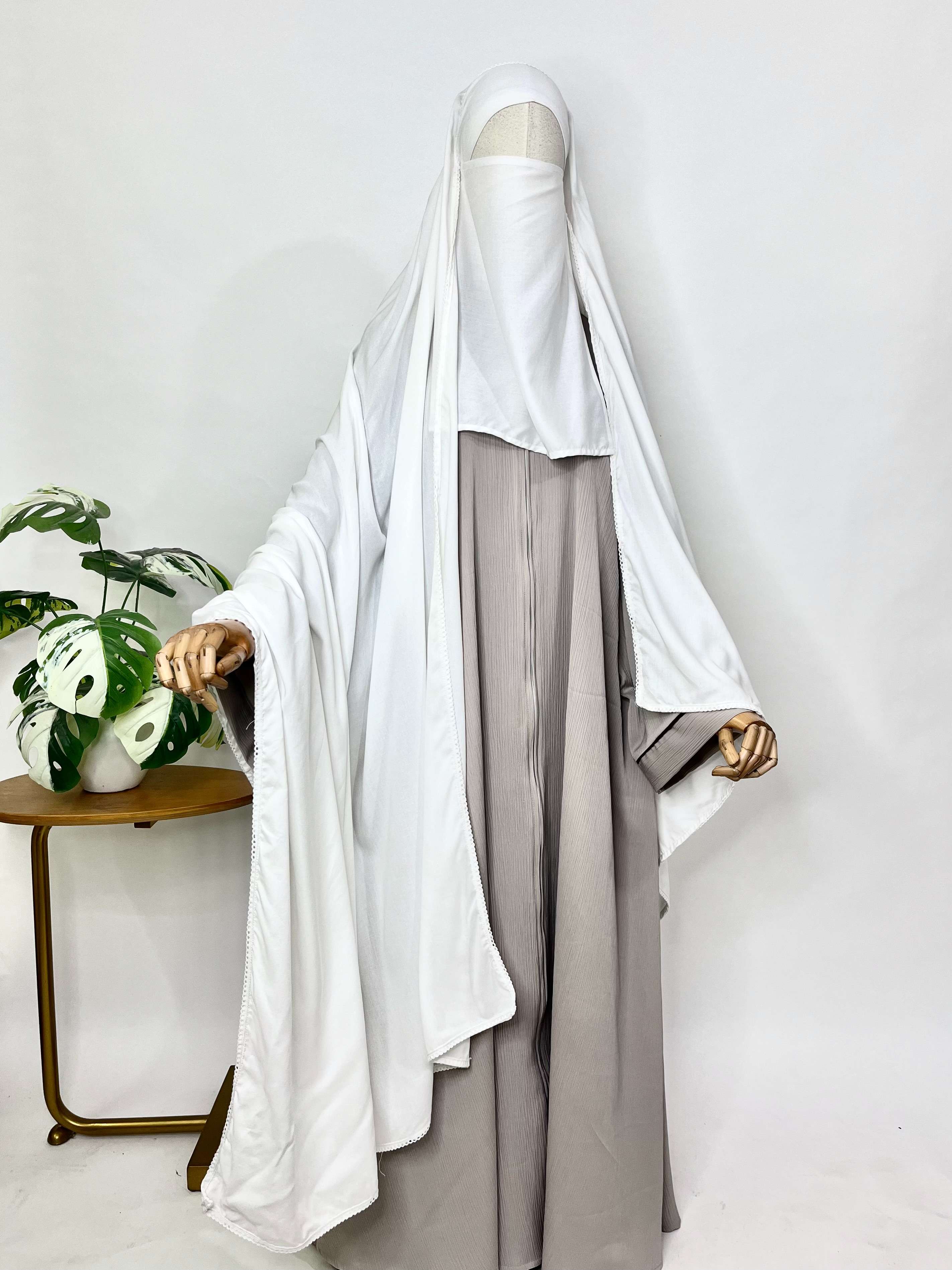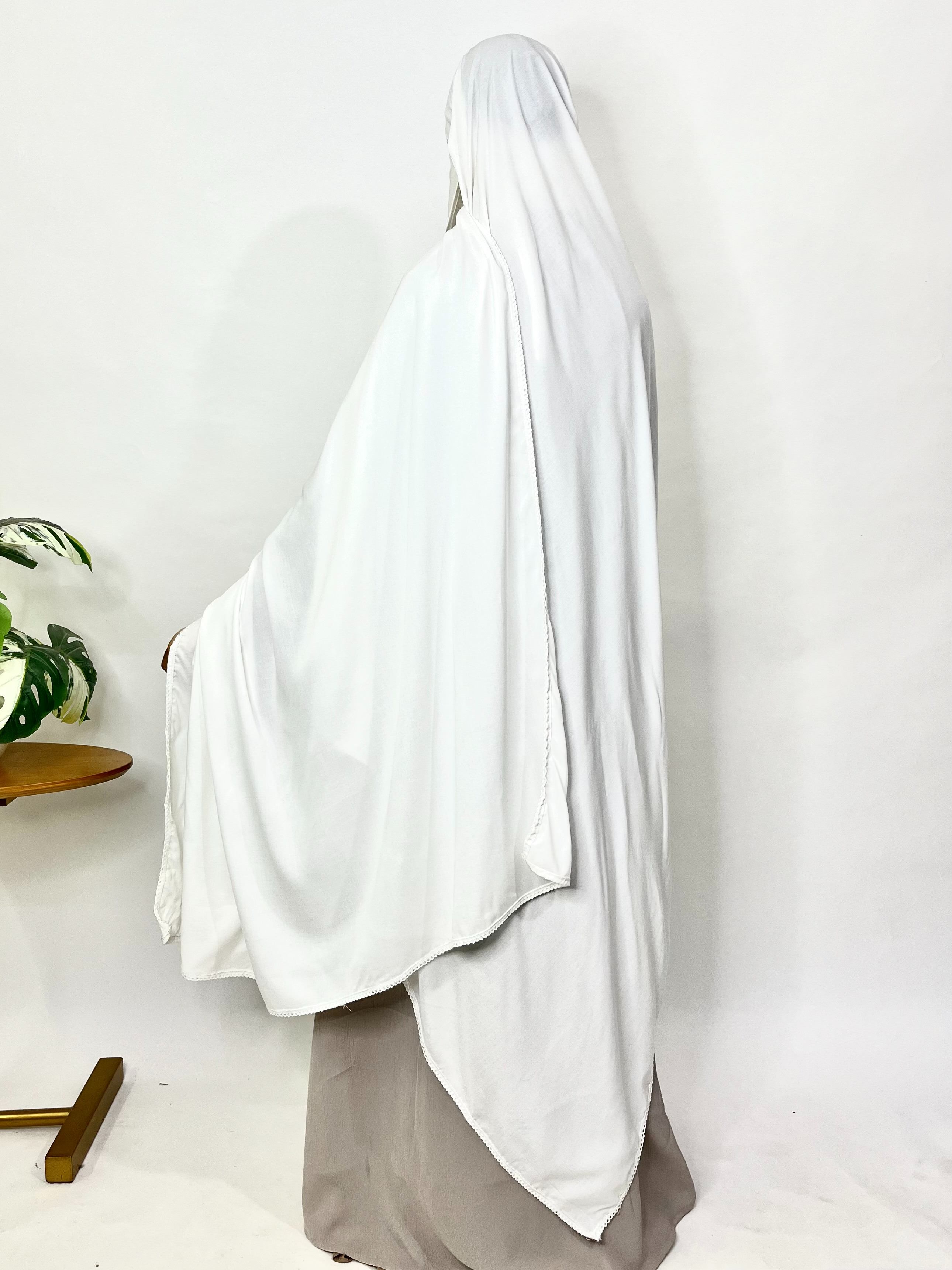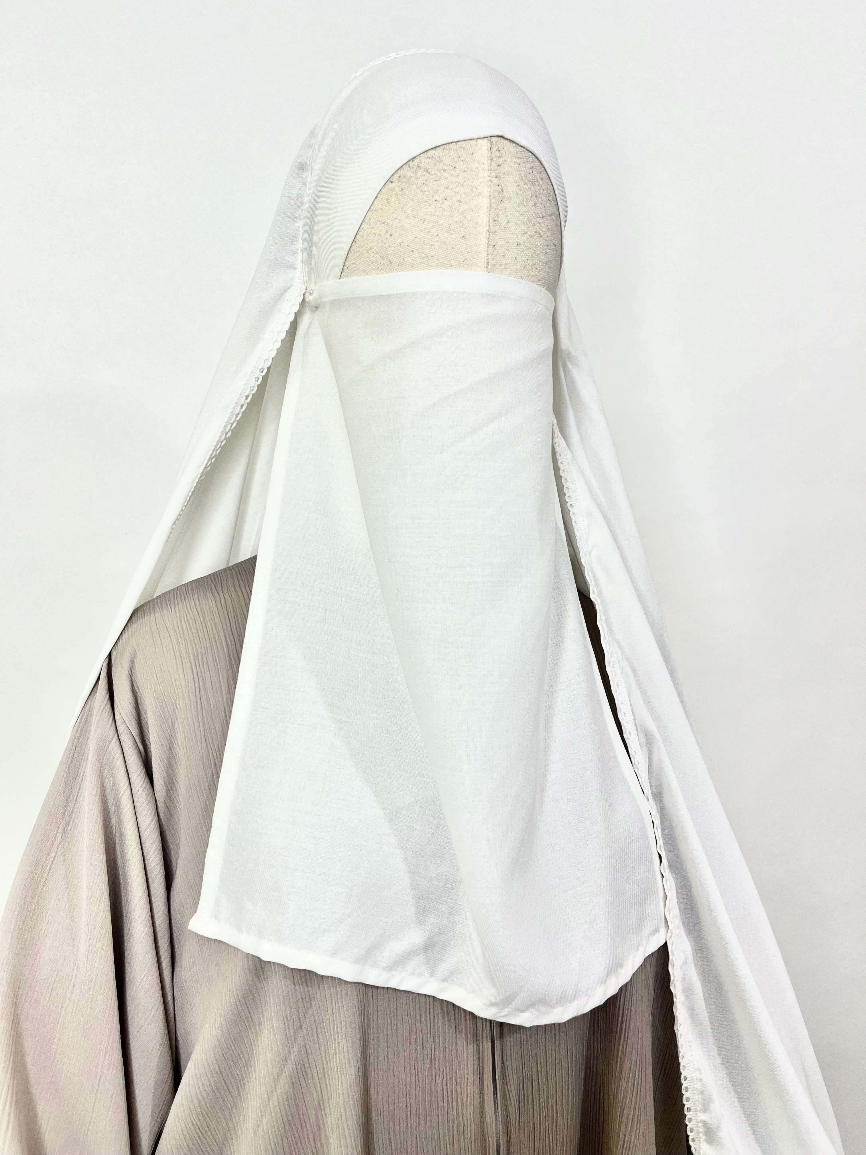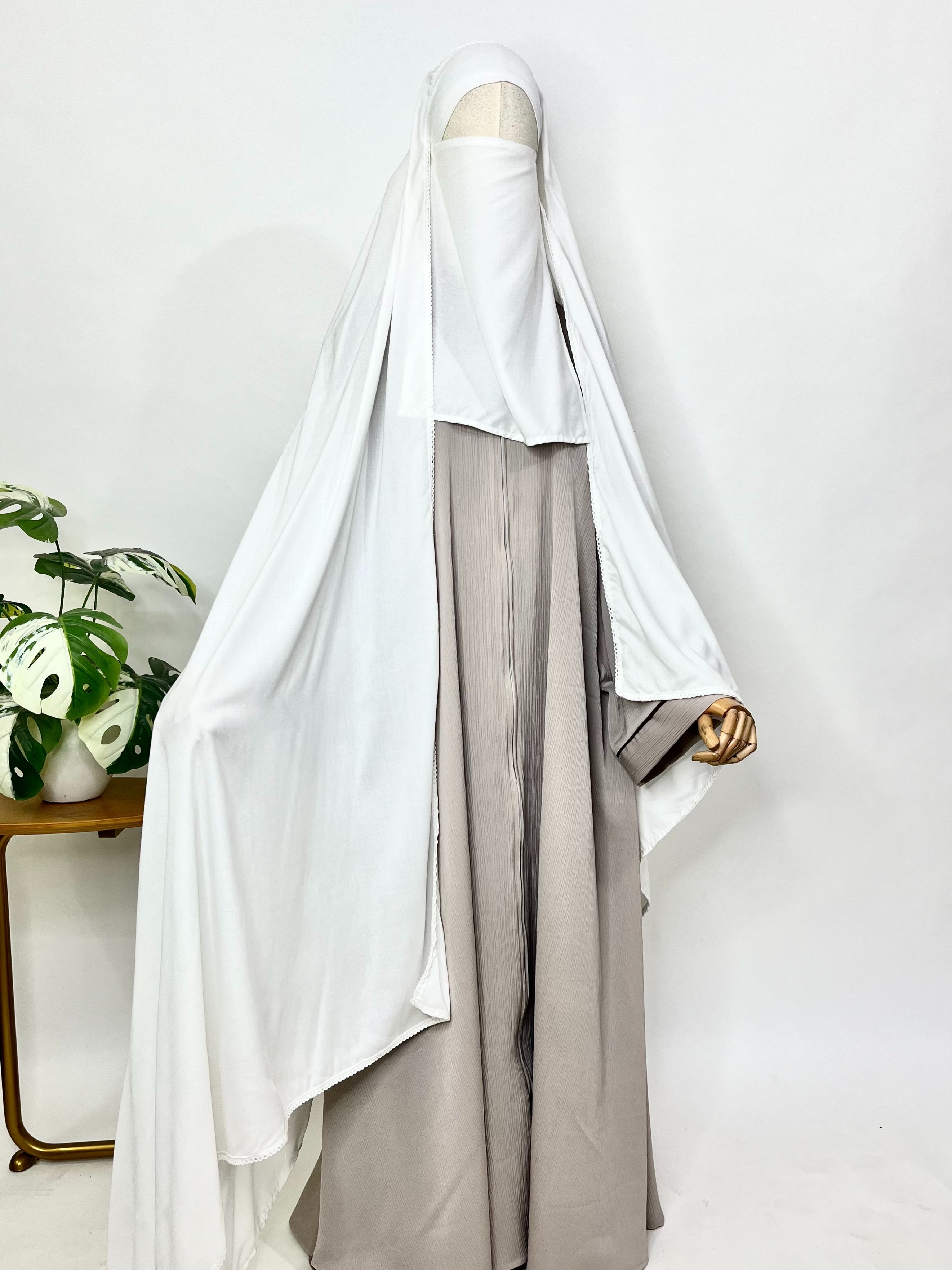 Embrace modest elegance with the White Pakeeza Chadar, a sleeveless front-open design that offers effortless layering for your everyday wardrobe. Featuring delicate side lace detailing that adds a touch of sophistication, this chadar combines style with practicality. The included nose piece ensures a secure, comfortable fit throughout the day. Perfect for those seeking graceful coverage without compromising on comfort or aesthetic appeal.