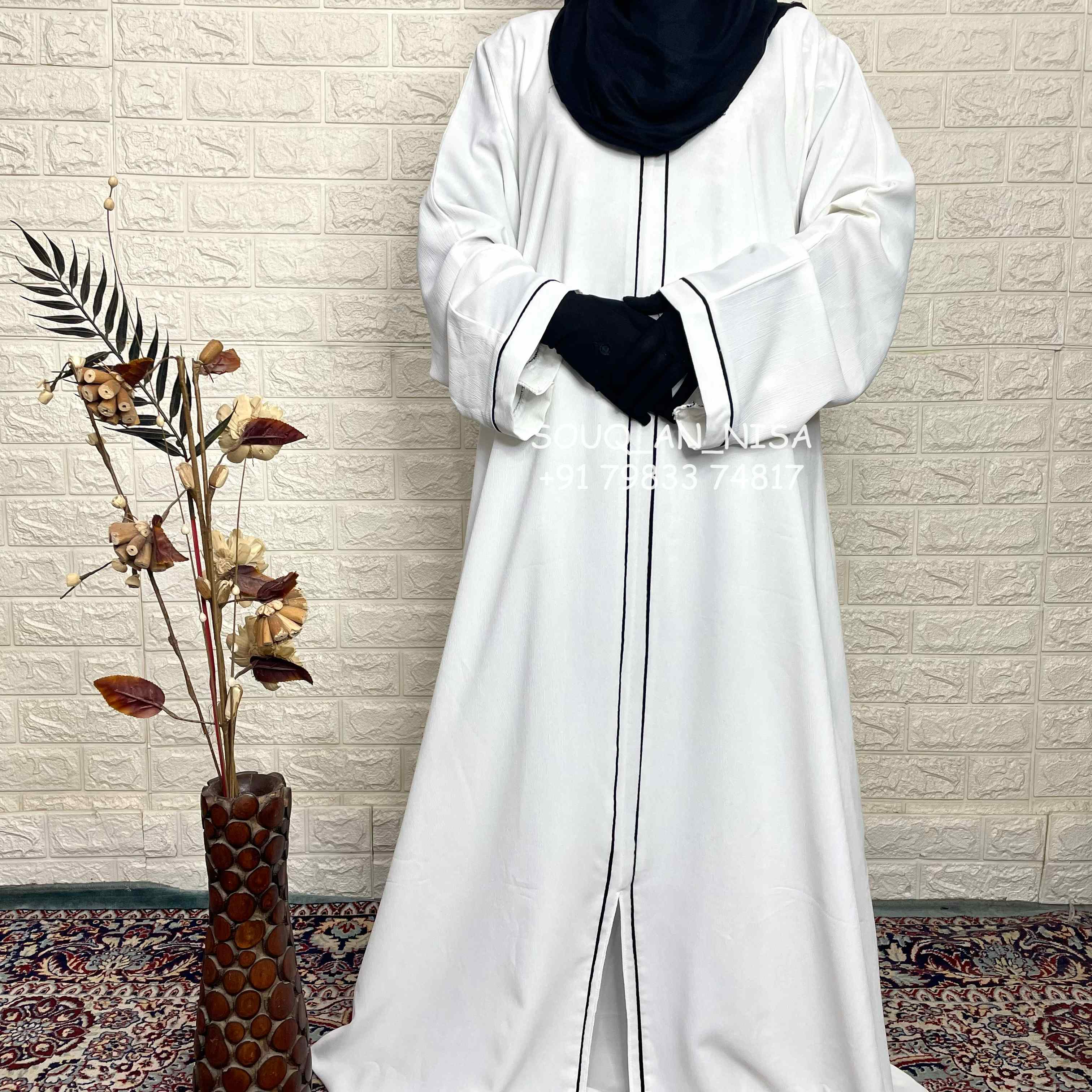 Elevate your style with our White Piping Abaya! Made with a luxurious crushed fabric, this abaya features a front close and a subtle slit at the bottom for effortless movement. The contrasting black piping adds a touch of sophistication to this timeless design. Embrace elegance with every wear.